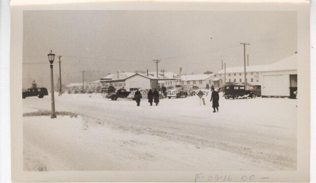Men and buildings in the snow old cars Fort Lewis