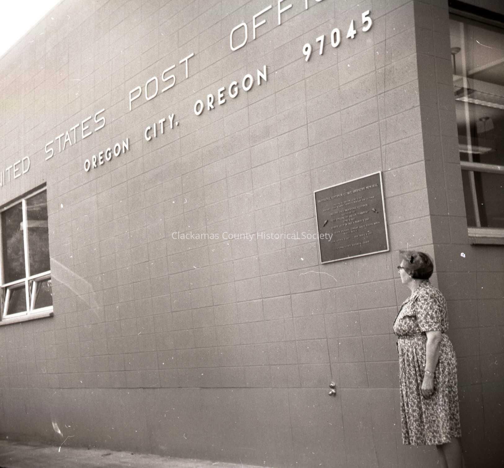 George Abernethy Memorial Plaque, #2, on Oregon City Post Office building, 15th and Washington. Vera Lynch is in the photo.Made/Created