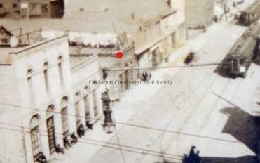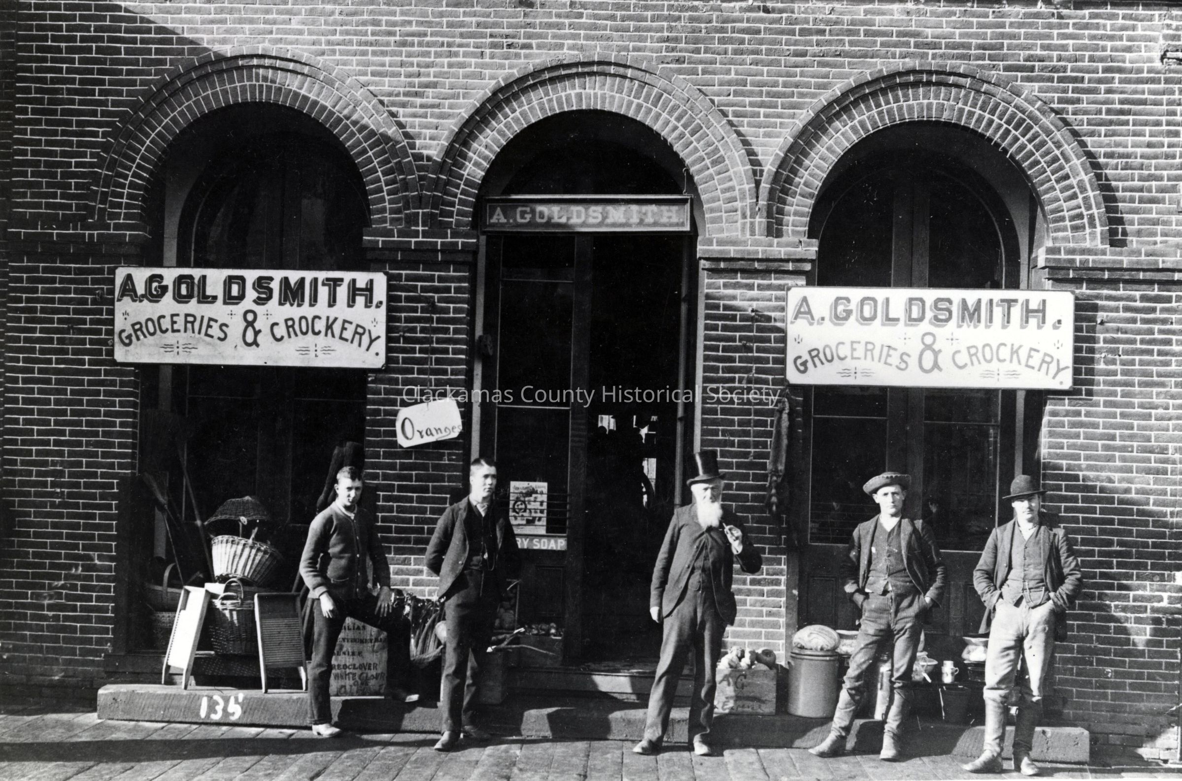 Note: The original description placed the photograph in Oregon City. However, further research is needed to locate A. Goldsmith's merchant shop in Oregon City. One building listed as a General Store in an 1884 Sanborn Map may be the location of a storefront similar to the one in the photograph. See attached. However, the entry steps and window framing are different. At this time, I am not convinced this structure existed in Oregon City. (JAH)Made/Created