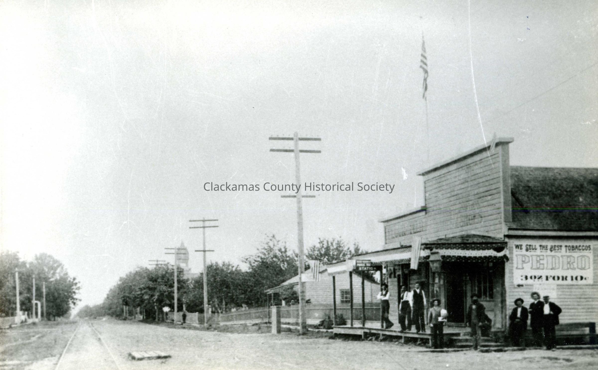 Wissinger's Store, side view. At the corner of Main and Washington, Wissinger's General Store and Post Office was a gathering place. The tower of the Schoolhouse is seen further down the street.Made/Created