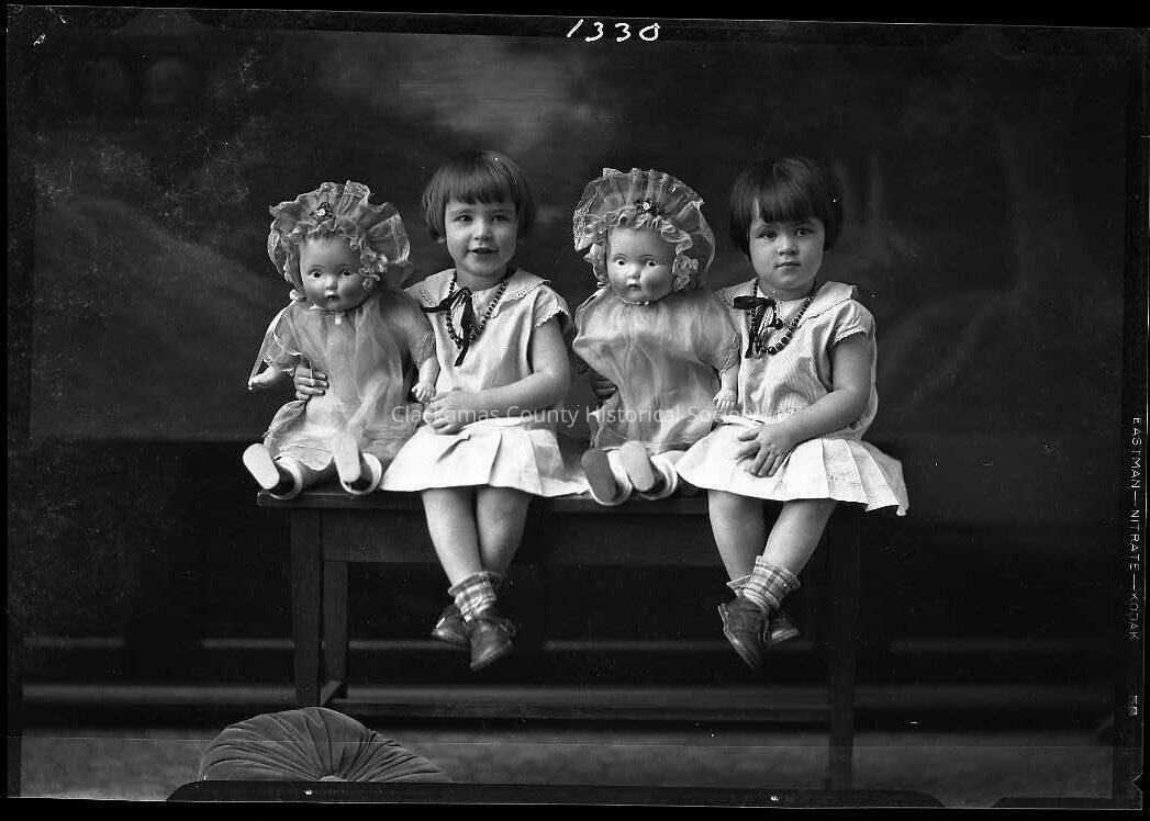 Photograph of twin girls with twin dolls for F.H. Wallace - December 1929 - NegativeEntry/Object ID