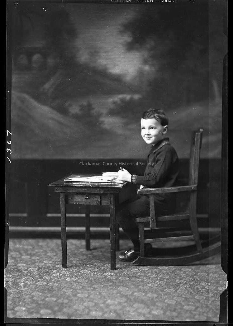 The young boy is seated at desk in a rocking chair with pencil in hand and papers in front of him on the desk.Made/Created