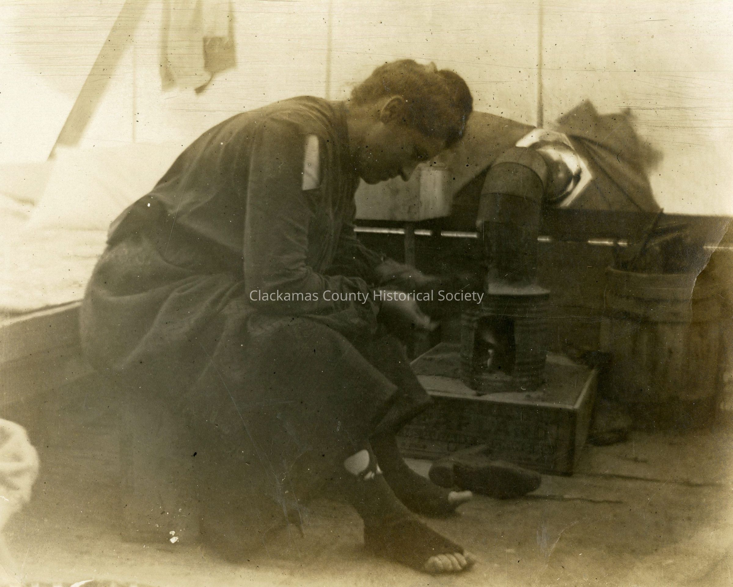 Dora (Talbert) Herrington sitting inside what appears to be a tent, shoes off, next to a stoveOther Names and Numbers