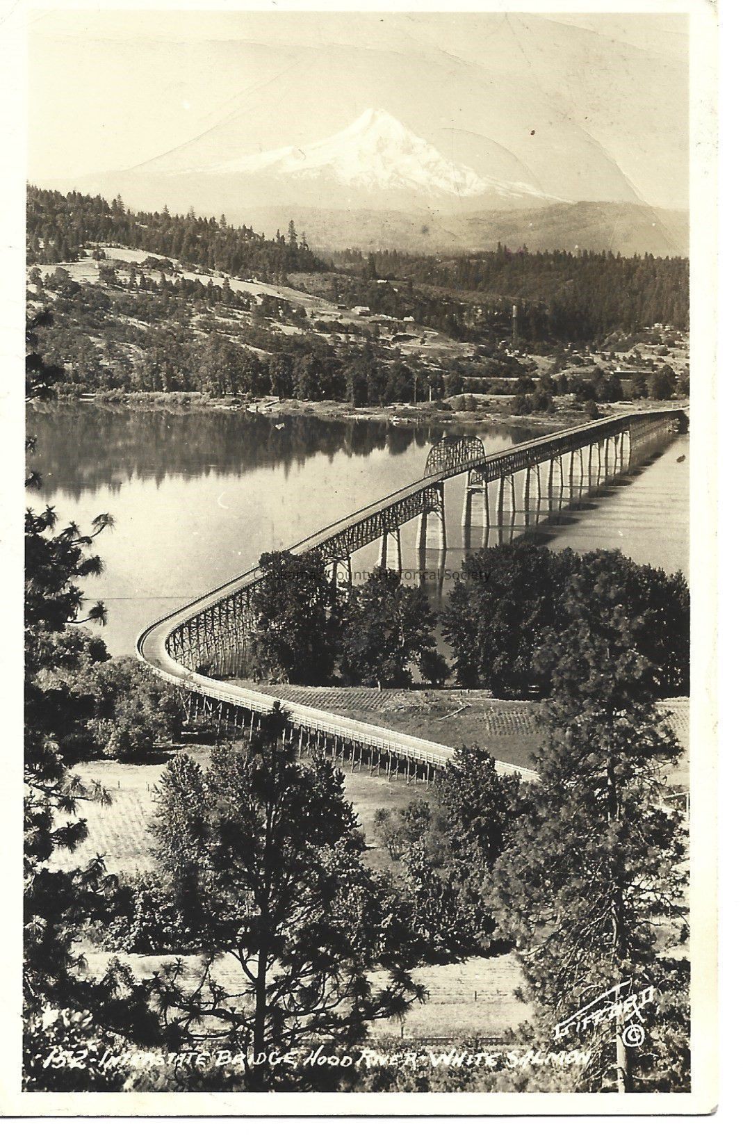 Photograph postcard - long bridge over Columbia river with Mt. Hood in background. At bottom of photo "152 Interstate Bridge Hood River White Salmon". 2 cent stamp