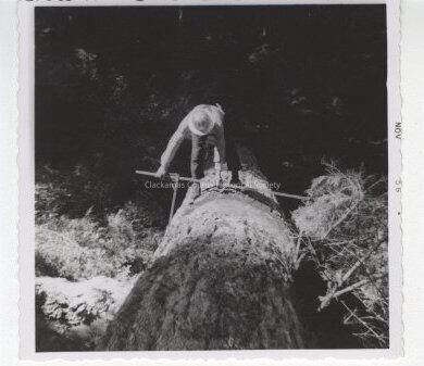 Man standing on large cut tree