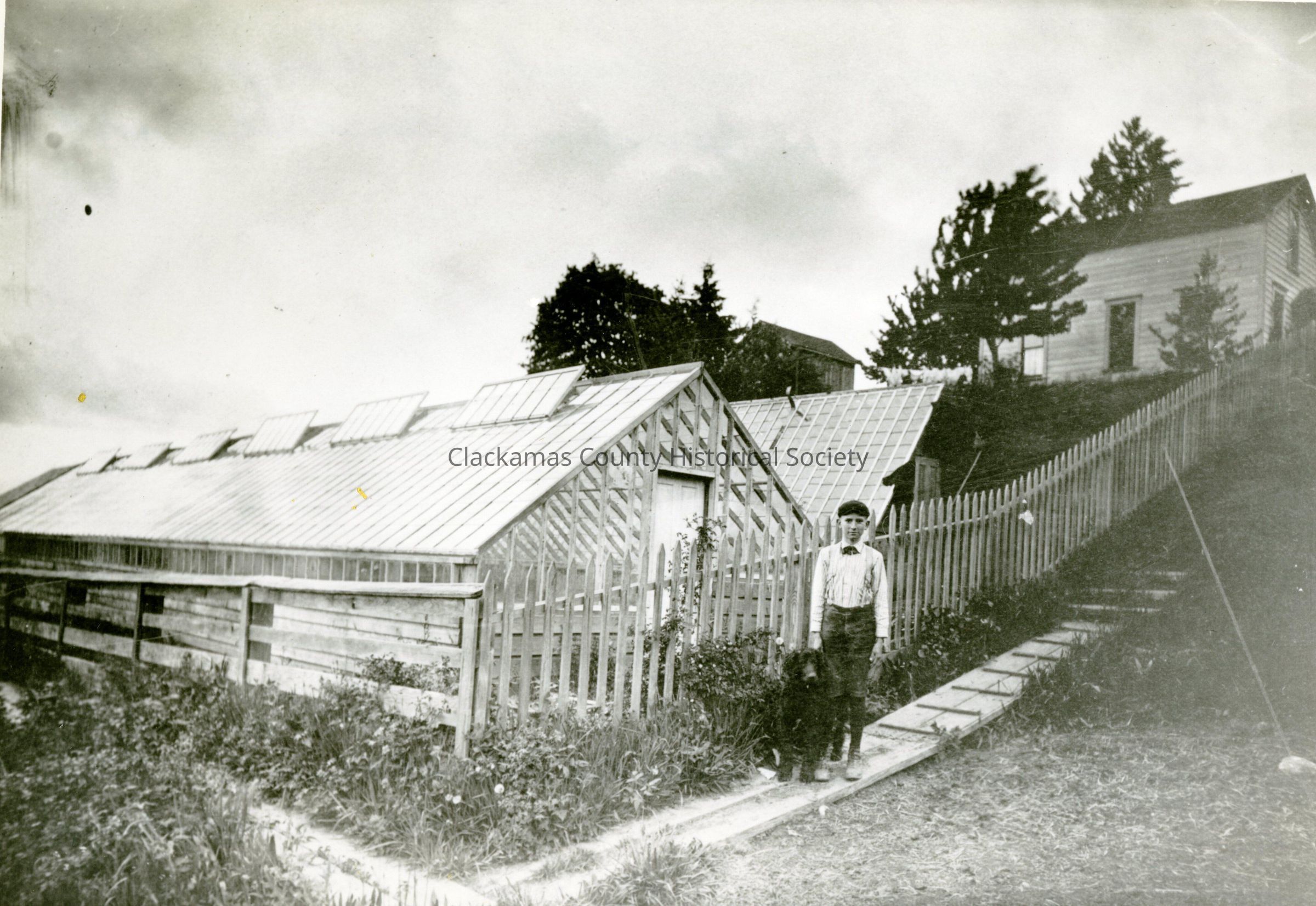 Sam Roake, Jr. in front of his father's greenhouses. The Sam Roake House is on 15th Street above Jefferson Street, Oregon City.Made/Created