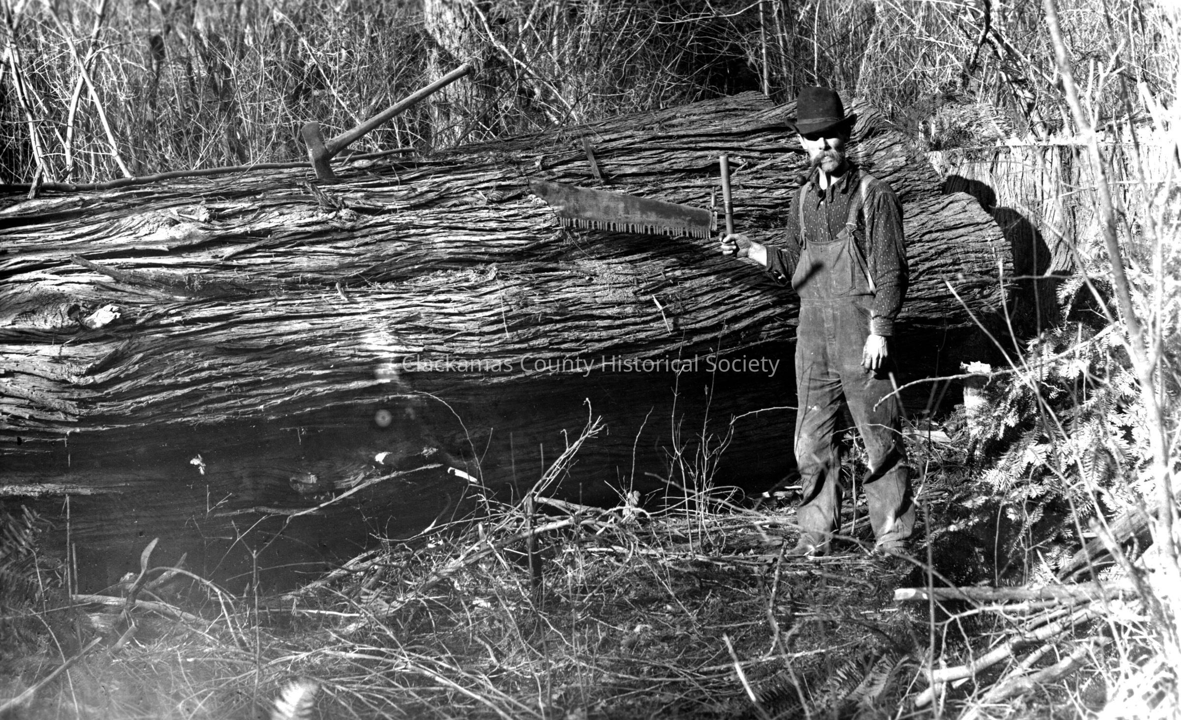 Al Granquist and Cedar Log. Huge tree cut down with a crosscut saw.Made/Created