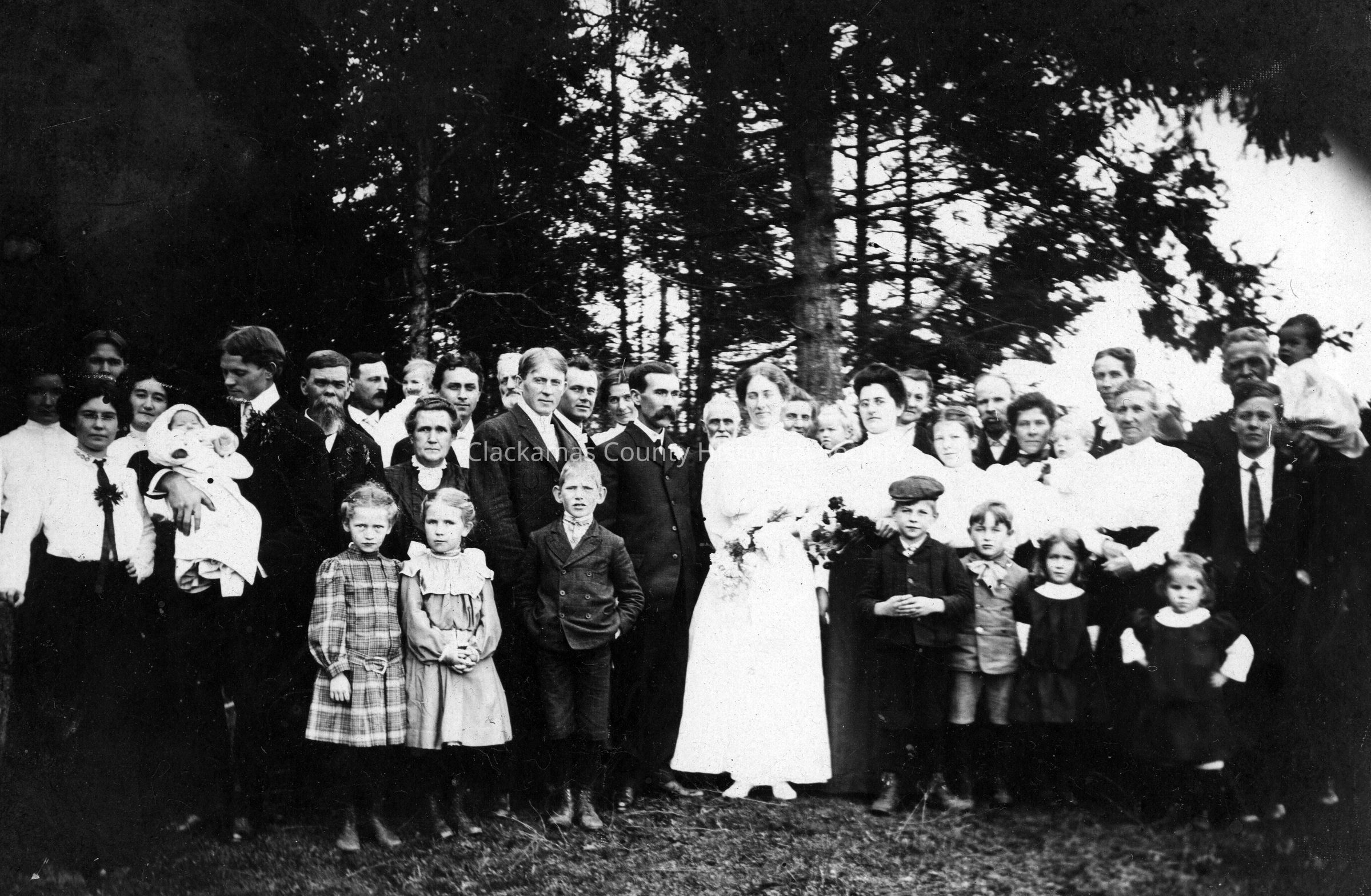 1st Row Adults: 1.Agnes McArthur,2. Frank McArthur (Baby Nanette), 4. Grandpa Pitts, 5.Grandma Pitts, 6.Bob McArthur(bestman), 7.Jim Pitts (groom), 8. Alice McArthur Pitts (bride), 9. May Brown (bridesmaid), 10.Maggie Brown?, (baby Isa Brown), 12. Grandmother McArthur, 13.Ellie Brown.