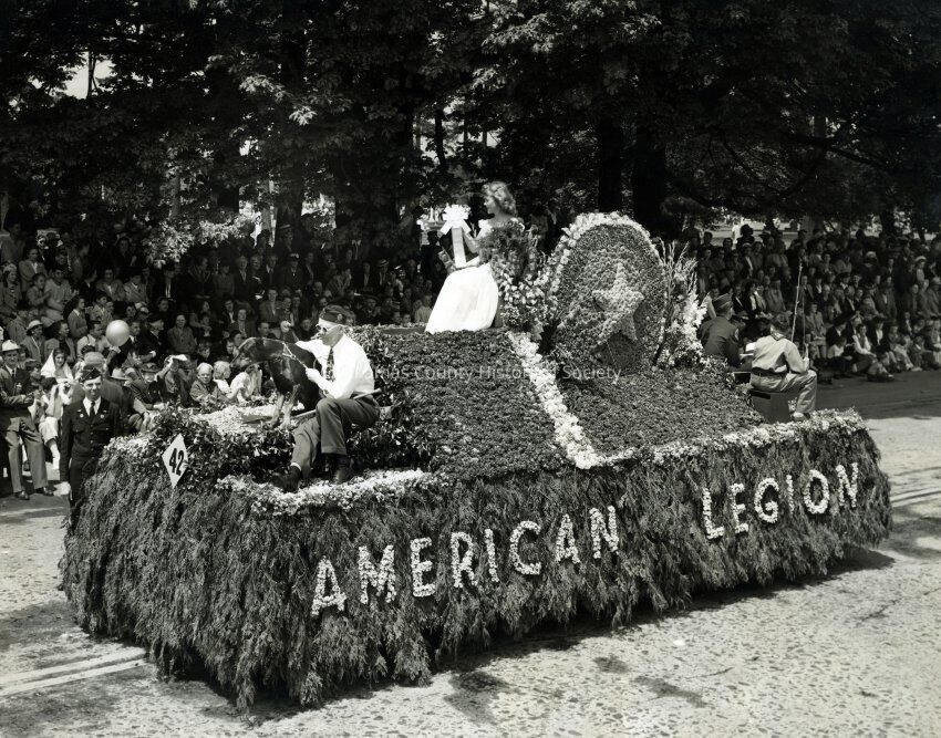 American Legion parade float. Unidentified people on parade route and on float. Possibly 1950's to 1960 or so.