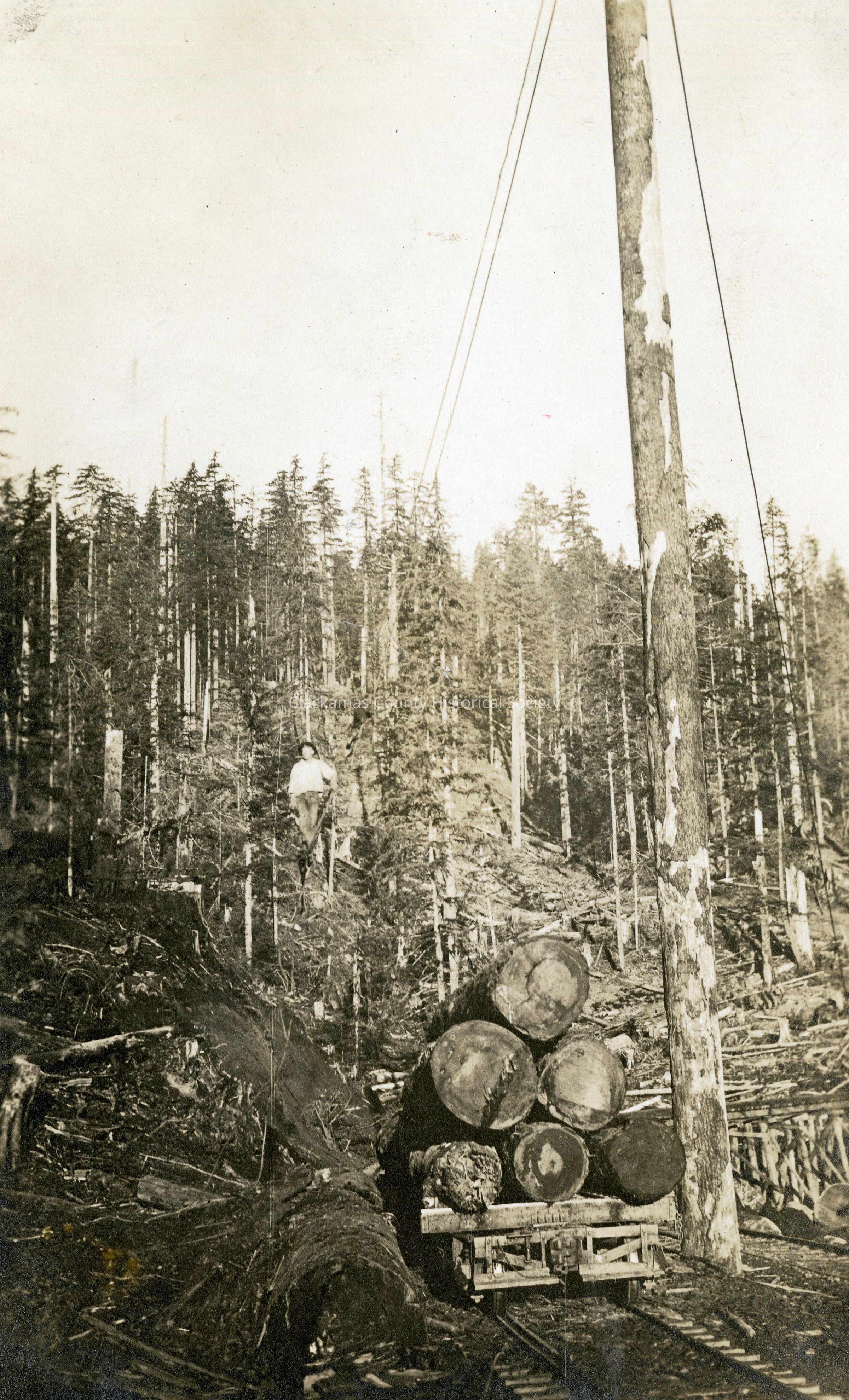Ariel Cable used to Move Logs Next to Railroad Car Loaded with Logs