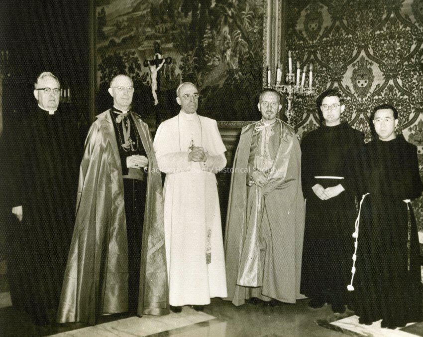Audience with His Holiness, Pope Pius XII, October 13th, 1952. From L-R: 1) Very Rev. Theodore J. Bernards, Oregon City; 2) Bishop Leipzig of Baker; 3) His Holiness, Pope Pius XII; 4) Bishop Kramer, O.F.M. of China; 5-6) Two of Bishop Kramer's Priests.