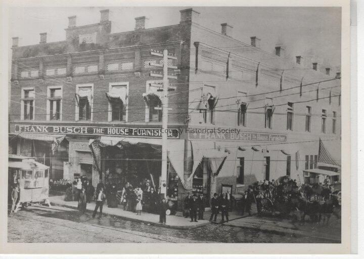 Frank Busch Furniture Store in the Weinhard Building at 8th and Main - 1900. Sources say Berry (Barry) Bellomy left the business to care for his ailing wife in 1900. The photo reflects the subsequent name change (JAH 12/2022).