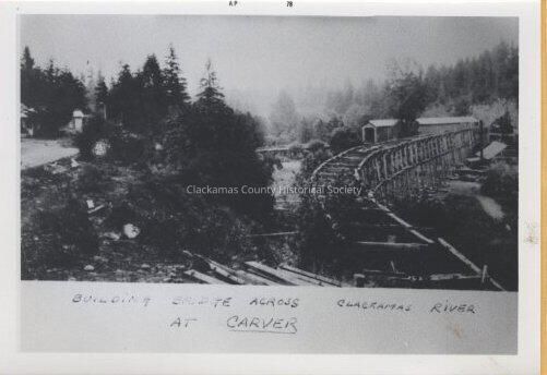 Carver Bakers Bridge Building at side railroad trestle Bridge over Clackamas River Gift of Fred Kildow