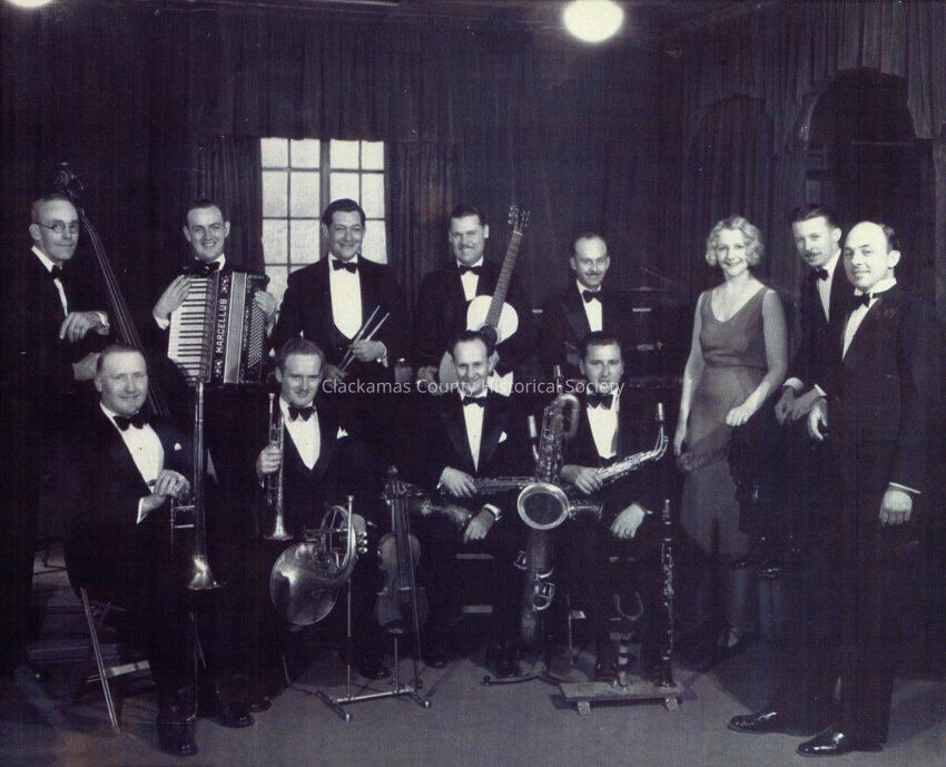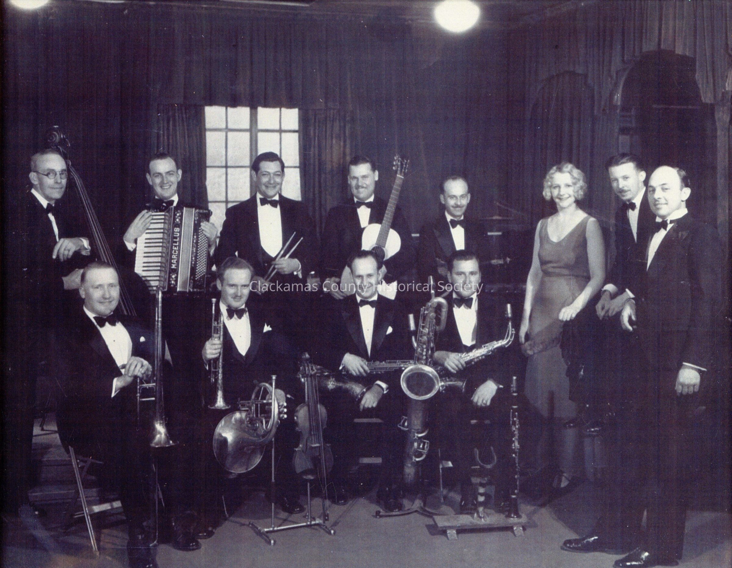 Band. Marcellus Martin on accordian; George Pillips (?) on trombone; Red Dunning (?) on trumpet Portland bands, 1940's - 1950's.Made/Created