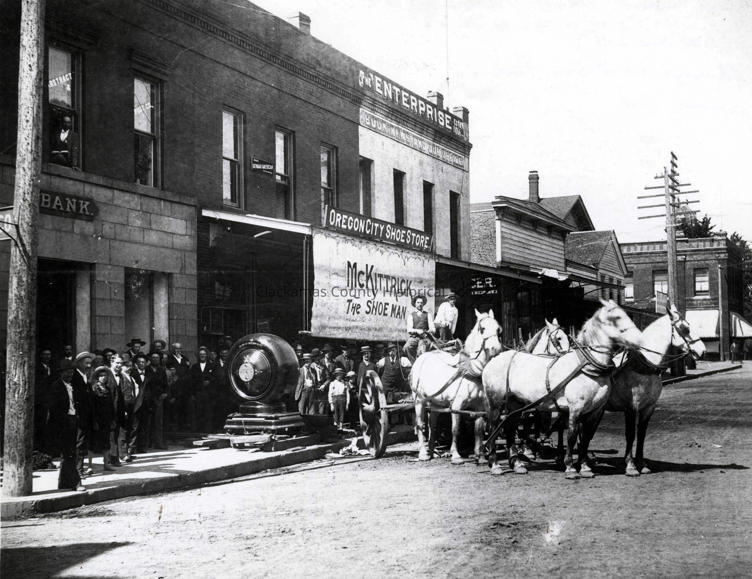 Bank of Oregon City Vault. McKittrick's Oregon City Shoe Store is in photo. The Enterpirse is in photo. 670 Main Street.Made/Created