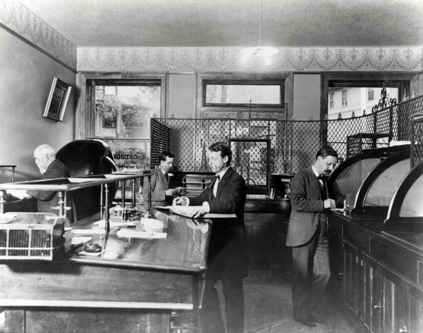 Interior of Bank of Oregon City, 1896. 4 men in photo working in bank.Made/Created