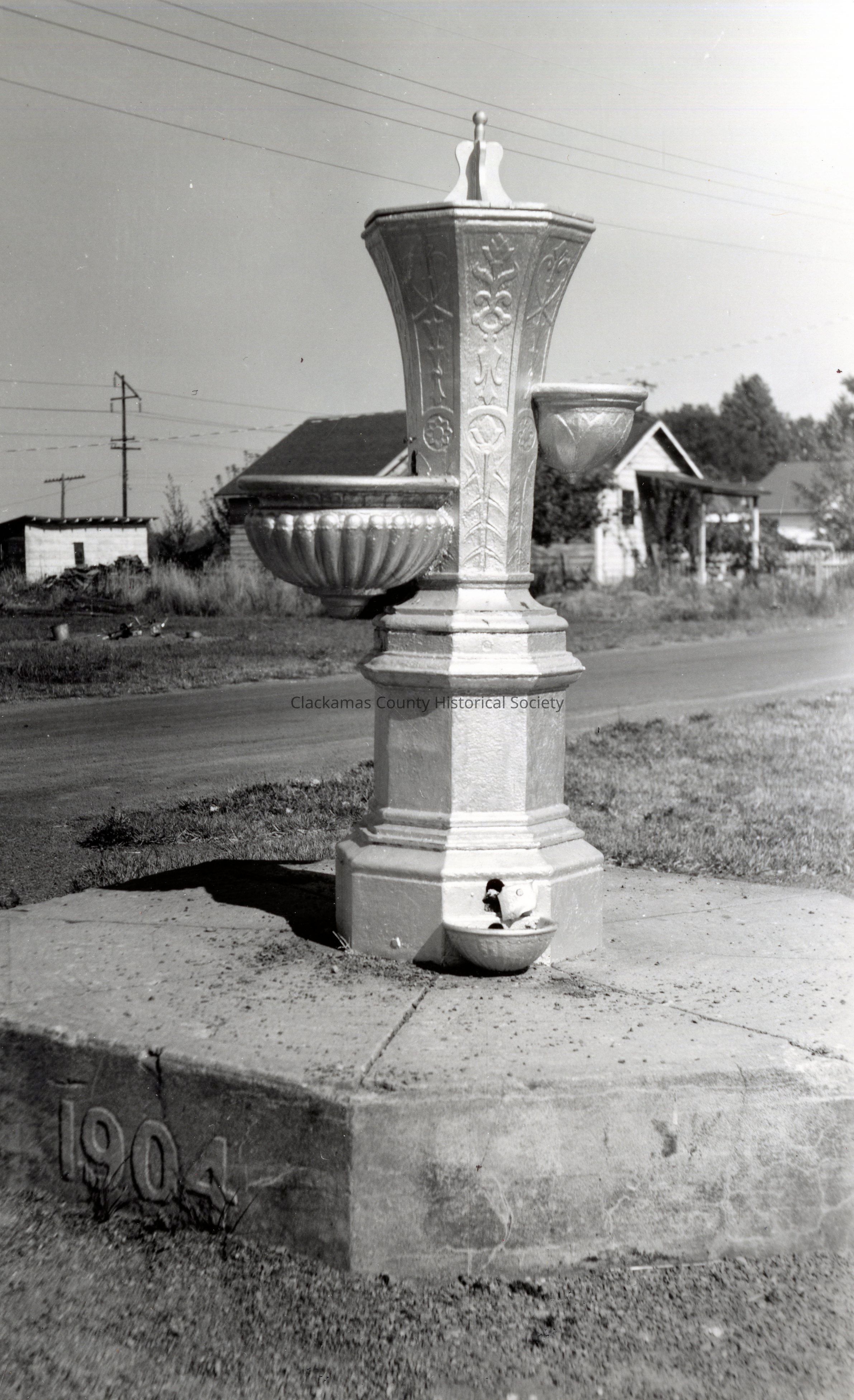 --- Written in 1955: More than 30 years ago the "Barlow Bird Bath" was built by Miss Mary Barlow as a memorial to her father, William (son of Samuel K. Barlow -builder of the Barlow Trail around Oregon's Mt. Hood) and his wife, Martha. There are two dates on the fountain, 1901 and 1904, which are the years in which Miss Barlow's parents died. The village of Barlow, which was named for the builder of the Barlow trail, is located on Highway 99E, about 15 miles south of Oregon City and mid-way between Salem and Portland, Oregon. Turning west across the Southern Pacific railroad tracks in Barlow, motorists take the graveled road to the left and drive two blocks to the old fountain.
