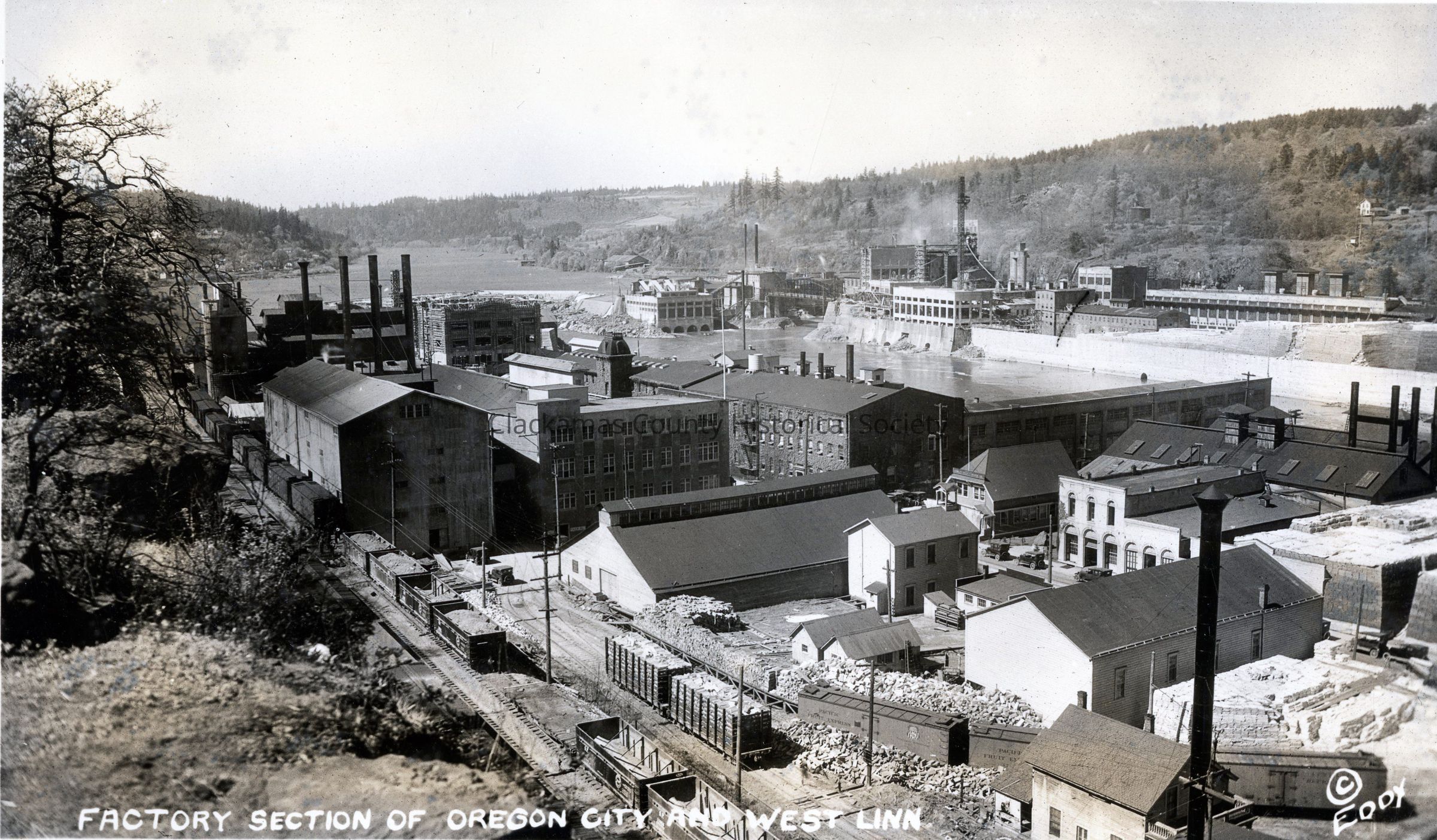 Factory section of Oregon City and West Linn. Looking south from of Oregon City Bluff. Woolen mill, paper mill near side of river. Electric generating station, paper mill far (West Linn) side of river.