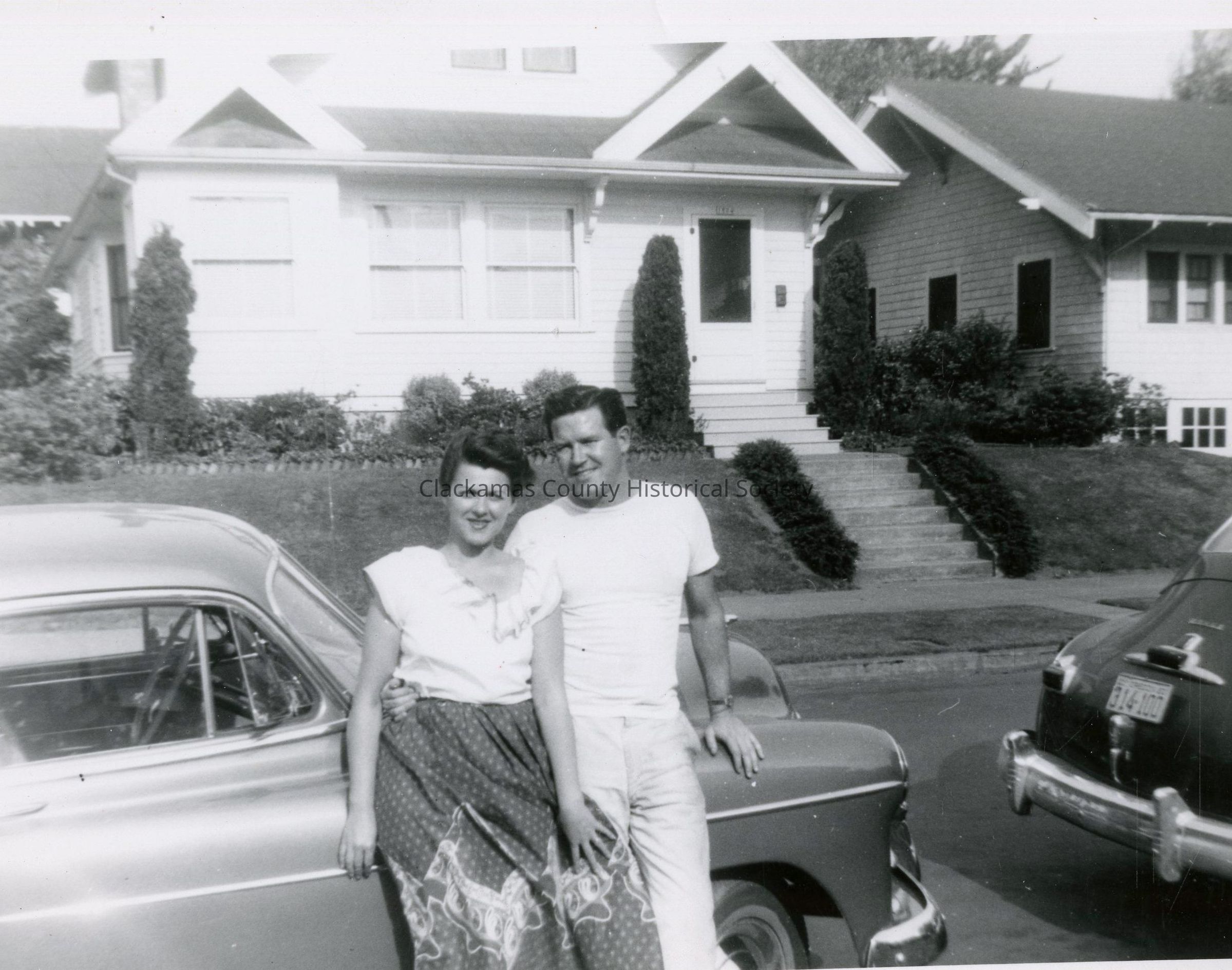 Laura May (Hoss) and Clifford "Bud" Bassett standing outside in front of a car on 46th St.Other Names and Numbers