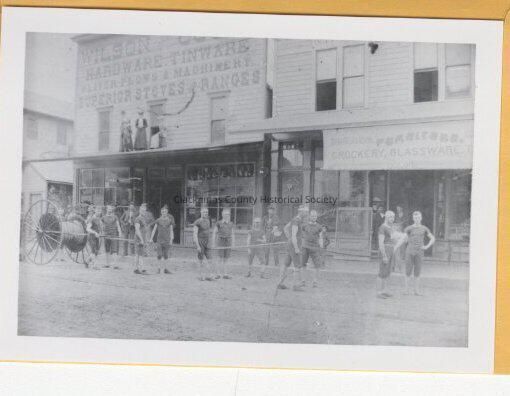 Oregon City Fire Dept., the Fountain Hose Company, in front of 516 (Bellomy & Busch) and 520 (Wilson and Cooke) Main Street. The Territorial Building on the east side of Main sits in its place. (JAH 11/2022)