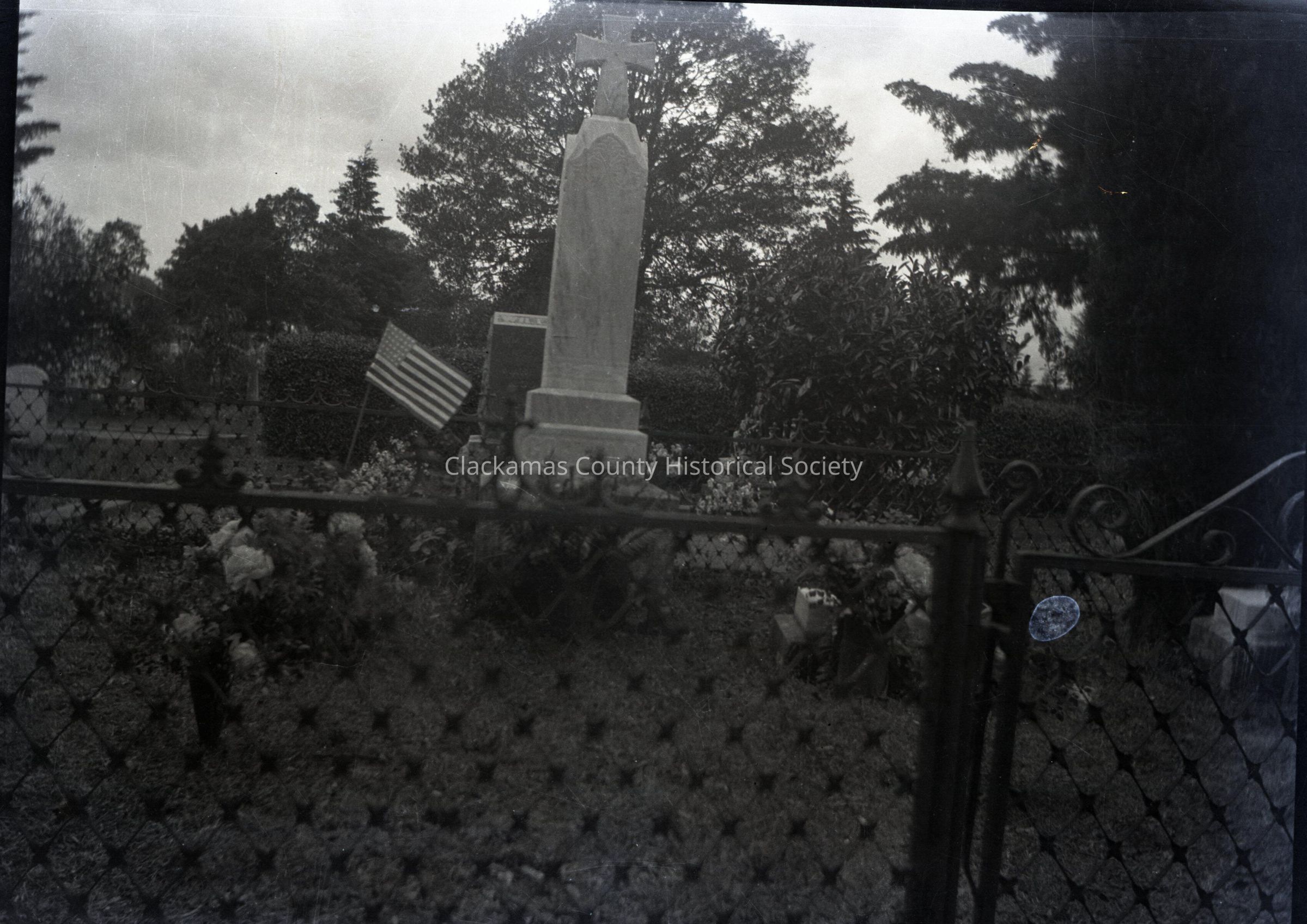 Fenced area with large plinth memorial with cross on top, Mountain View Cemetery.Made/Created