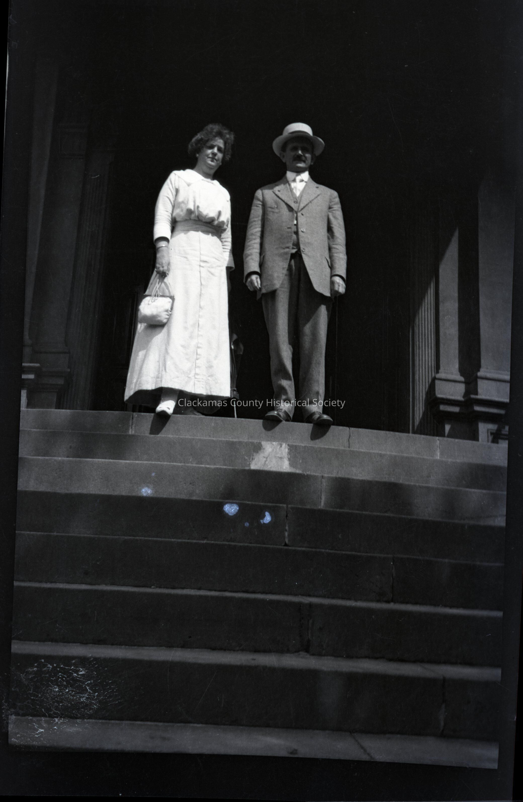 Hat Cochran with Deputy Deadman (assessor) on steps of Clackamas County Court House.Made/Created