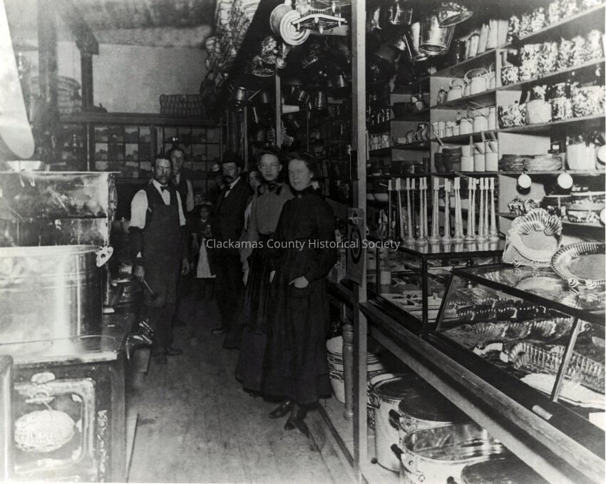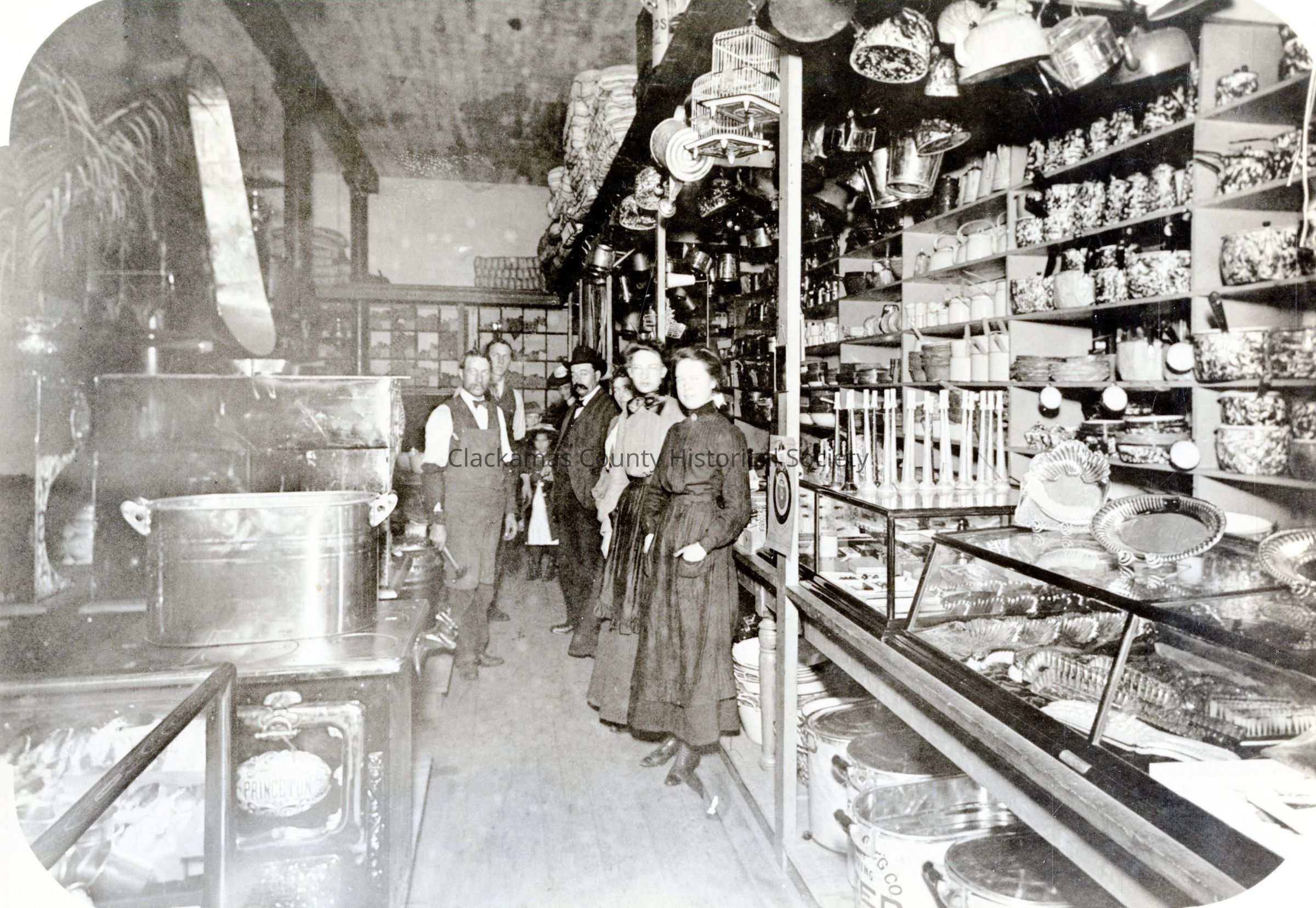 Bellomy & Busch. Interior. 1899. 8th and Main Street. 802 Main Street. Frank Busch, Sr. with hat and other unidentified people.Made/Created