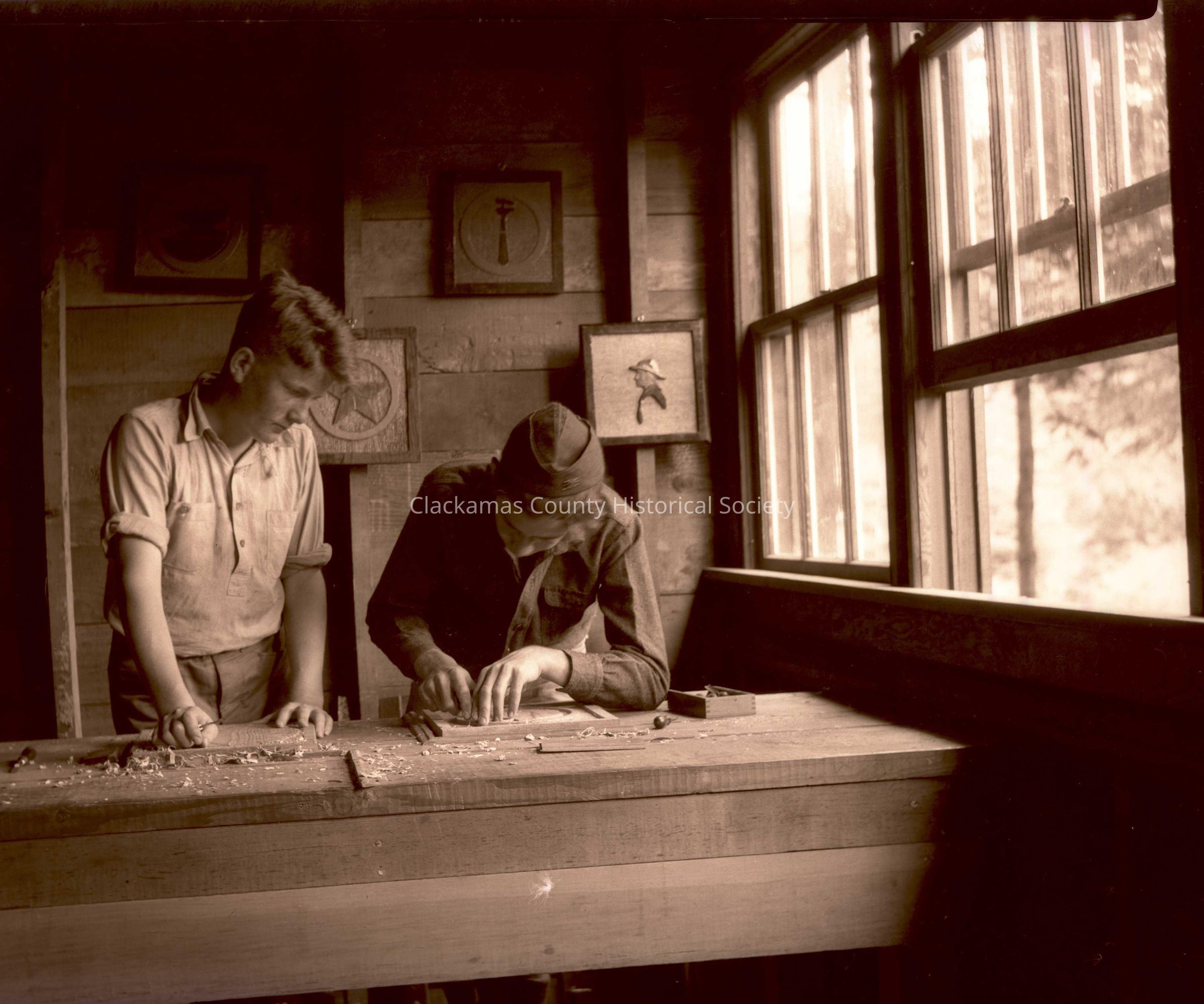 Photograph of Wood Carving for merit badge at Boy Scout Camp Meriwether.