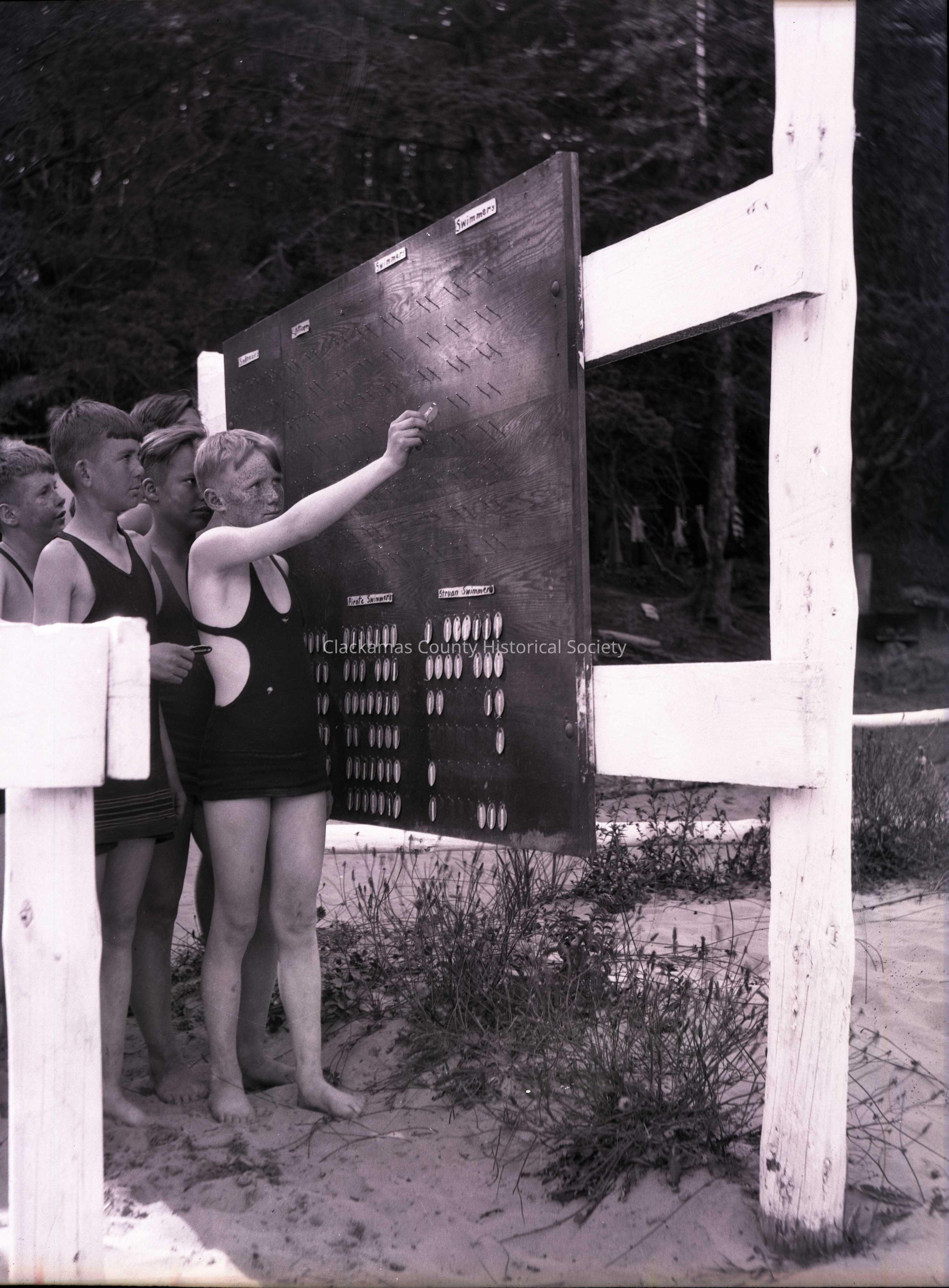 Photograph of Boy Scouts swimming Check in Board at Boy Scout Camp Merriwether.