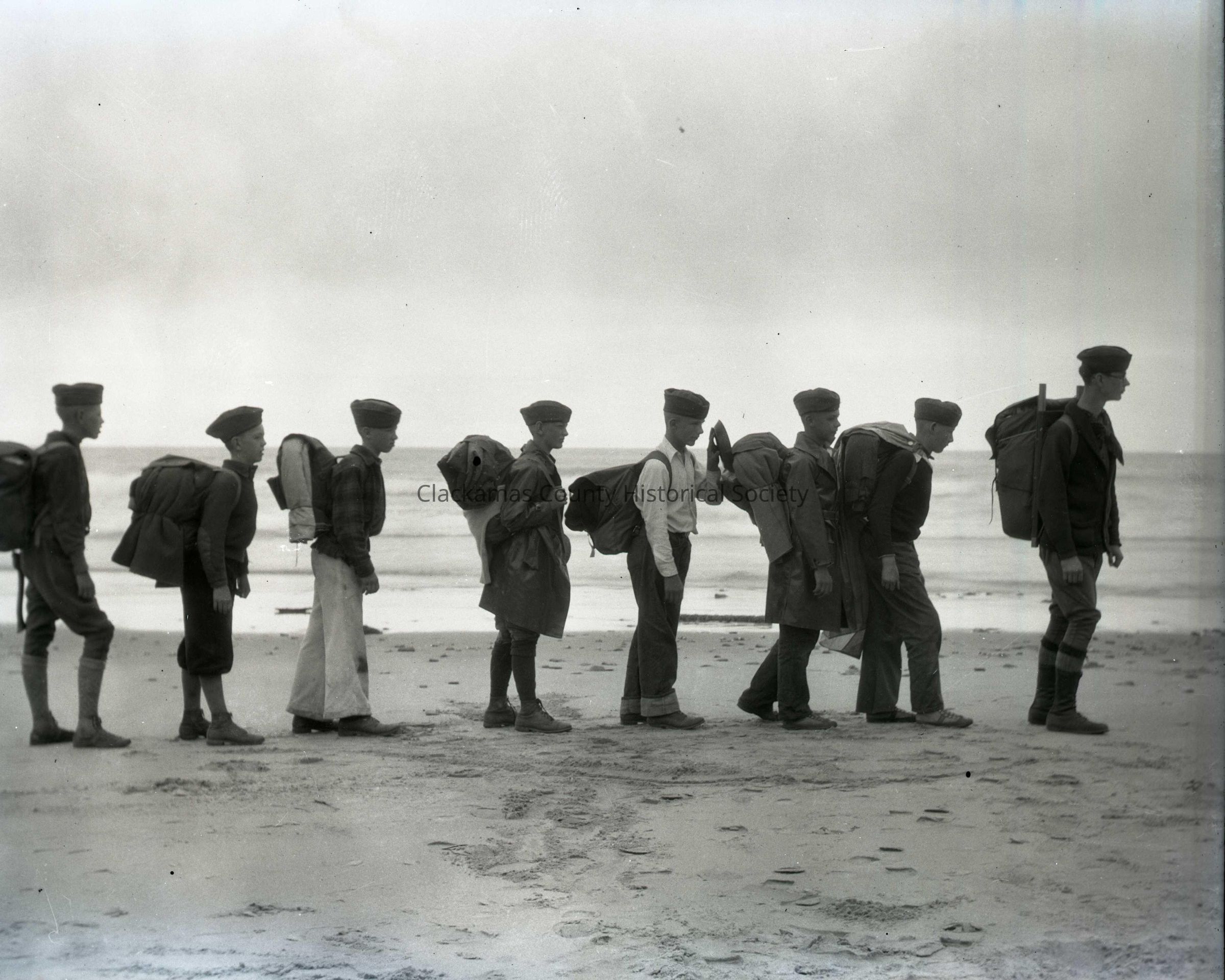 Unknown Boy Scouts on a Beach Hike at Boy Scout Camp Merriwether, Oregon The Pacific Ocean is in the backgrouond.