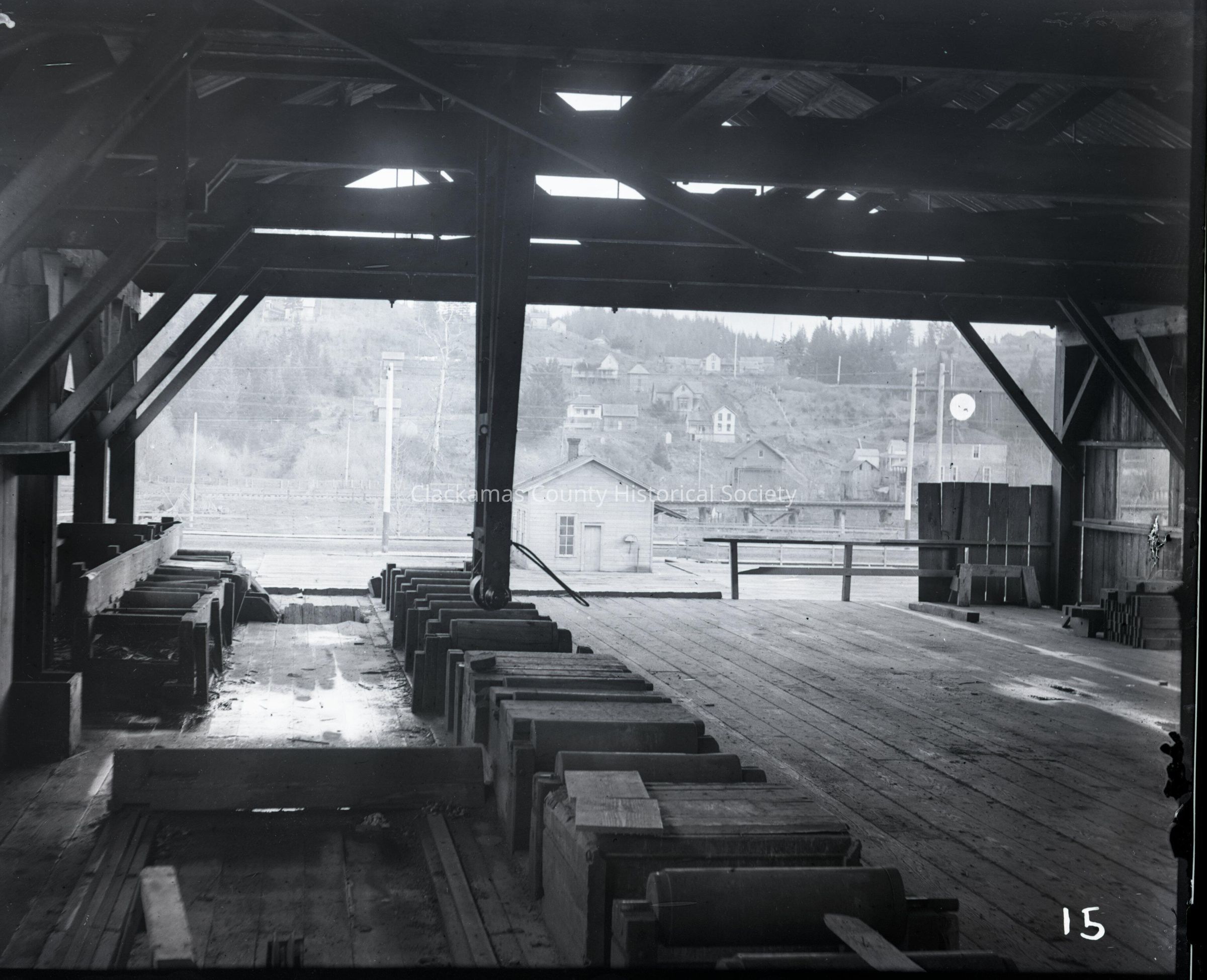 Interior of Broughton saw mill, looking toward hill in Oregon City, Oregon/ Green Point. Glass and film negatives in envelopes with photograph attachedMade/Created