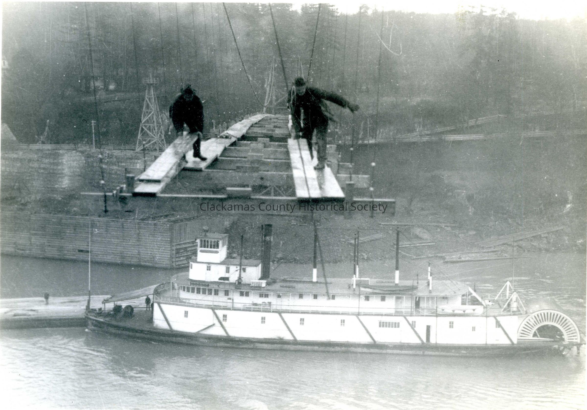 The building of the Temporary Pedestrian Bridge between Oregon City and West Linn. Steamboat "N. R. Lang" on riverMade/Created