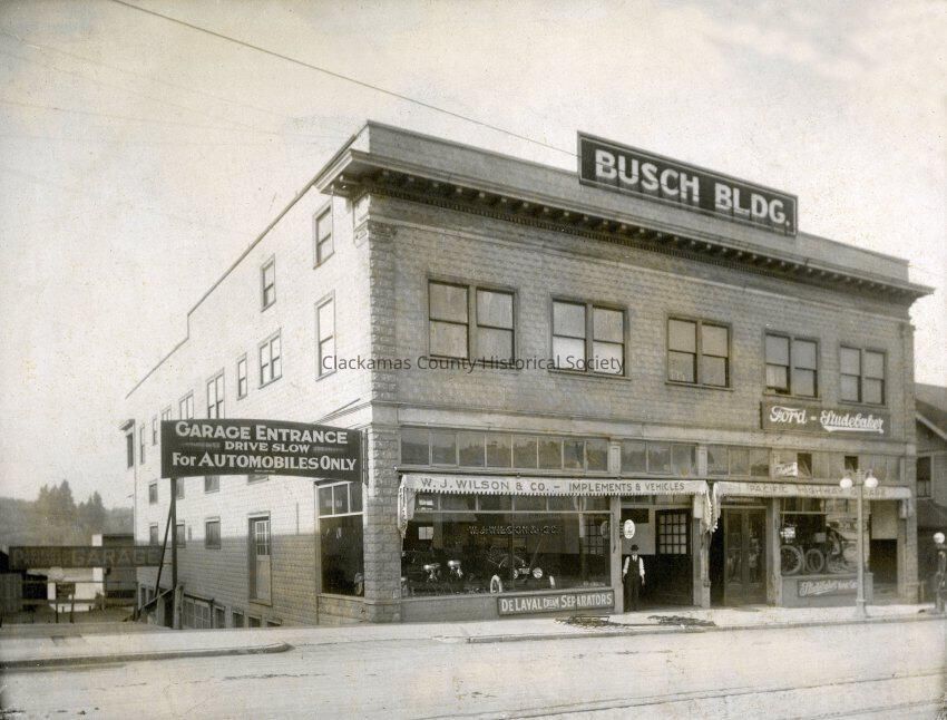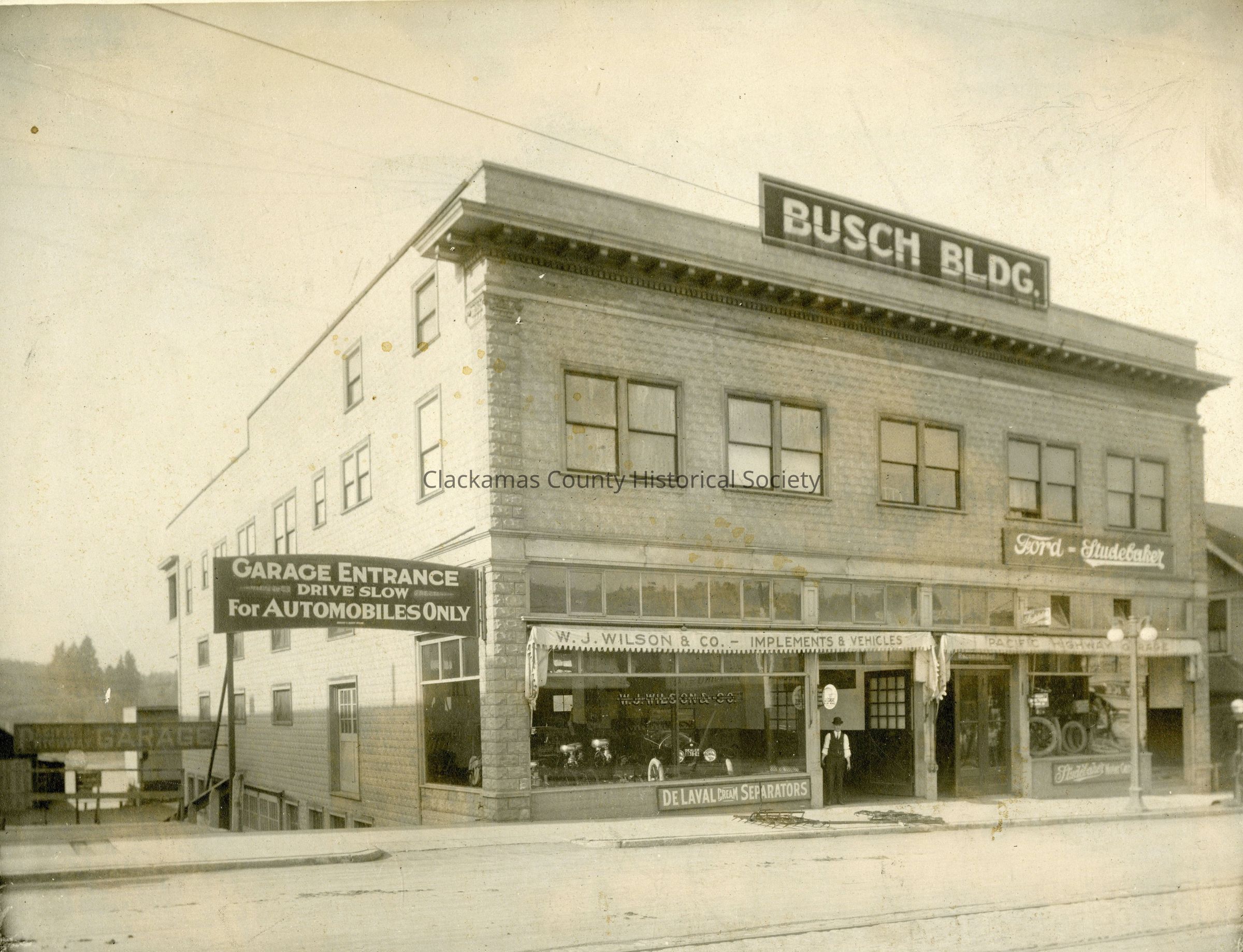 Busch Furniture Store. 12th (11th?) and Main Street, Oregon City. 1913-1914. Photo shows a garage entrance, W. J. Wilson & Co. - implements and vehicles. Ford and Studebaker sign.Made/Created