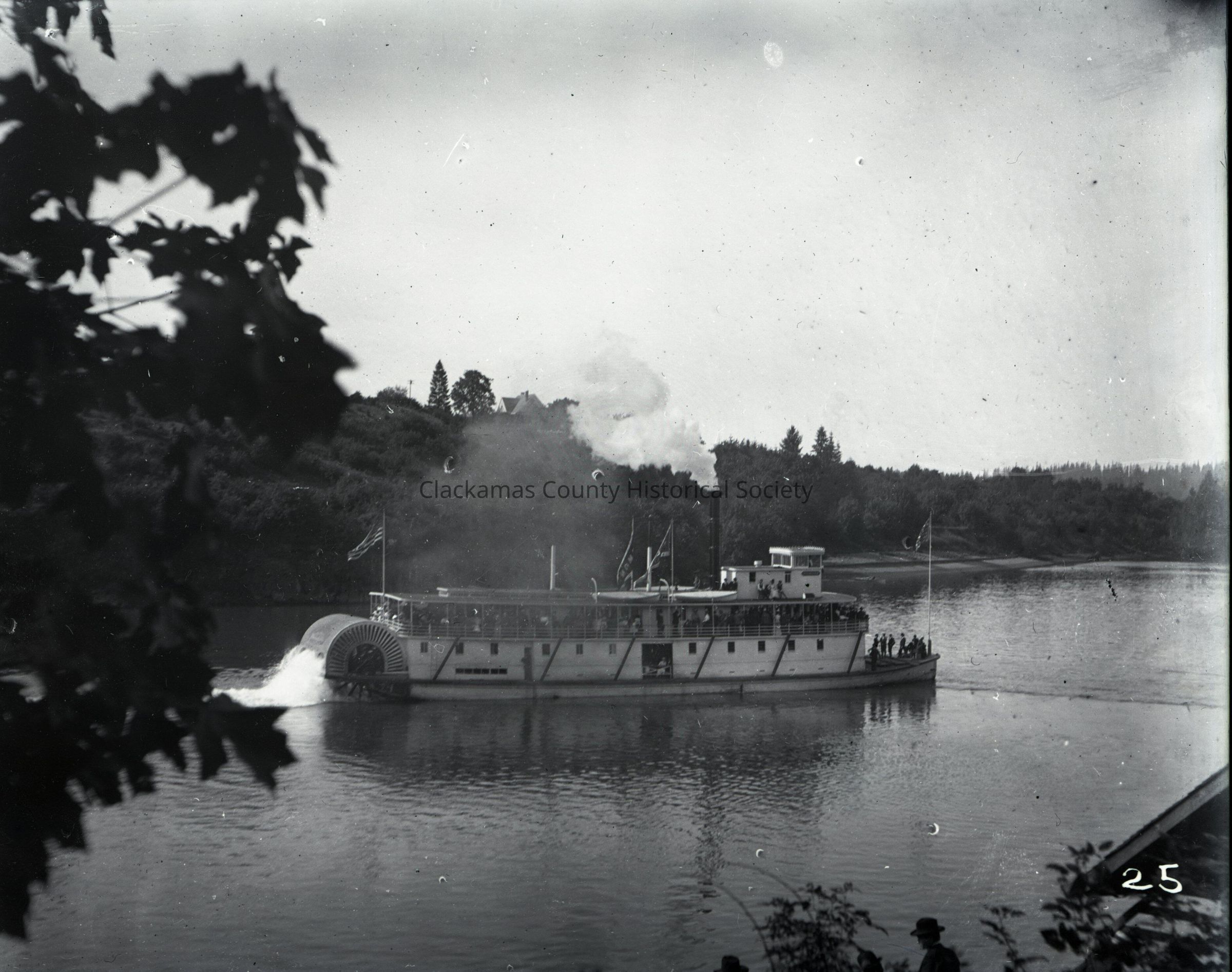 Sternwheeler on Willamette River below the suspension bridge, bound north. Glass and film negatives in envelopes with photograph attached.Made/Created