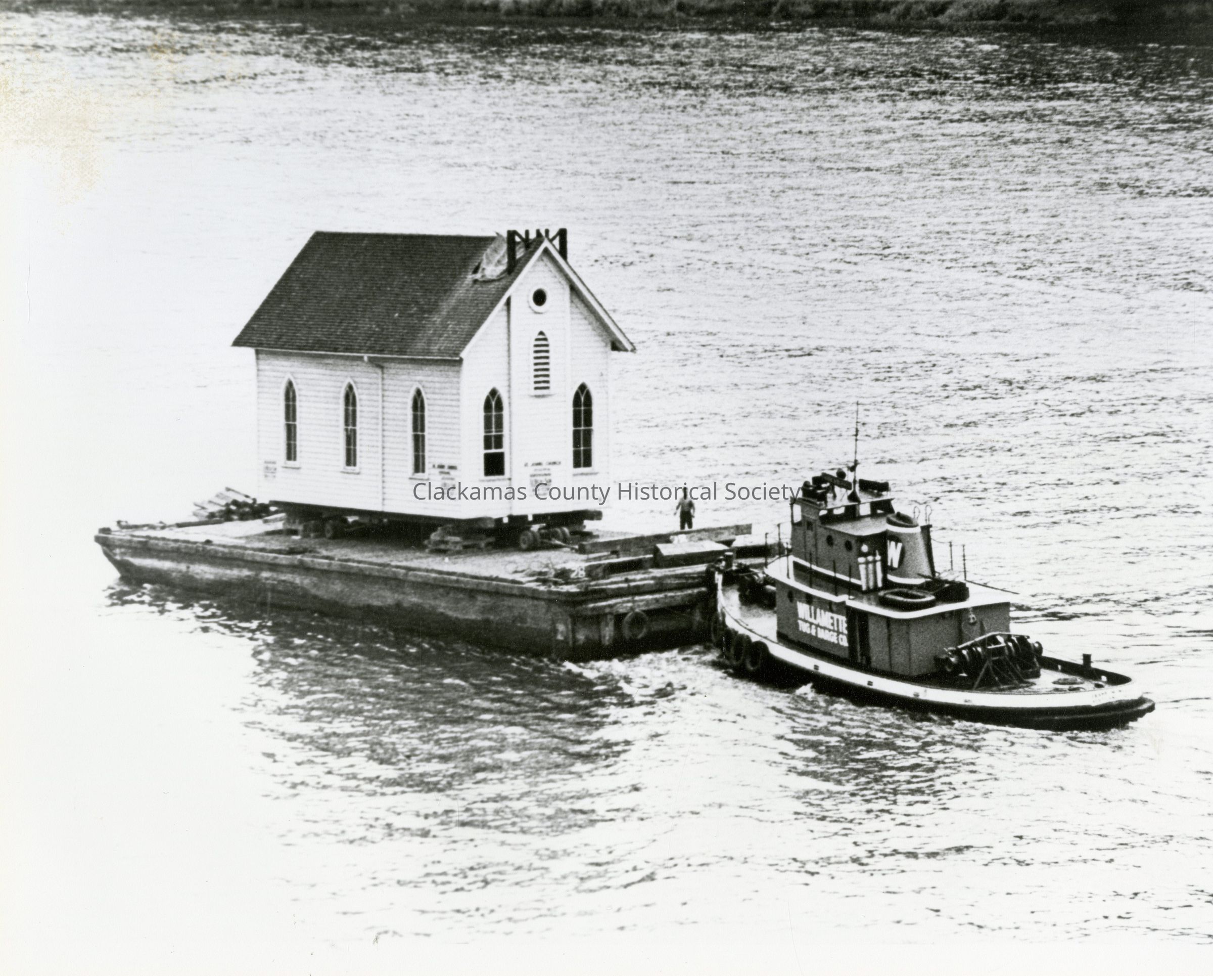 Milwaukie St. John's Episcopal Church, built 1851, being barged down Willamette River to new location at Sellwood Park in 1961.