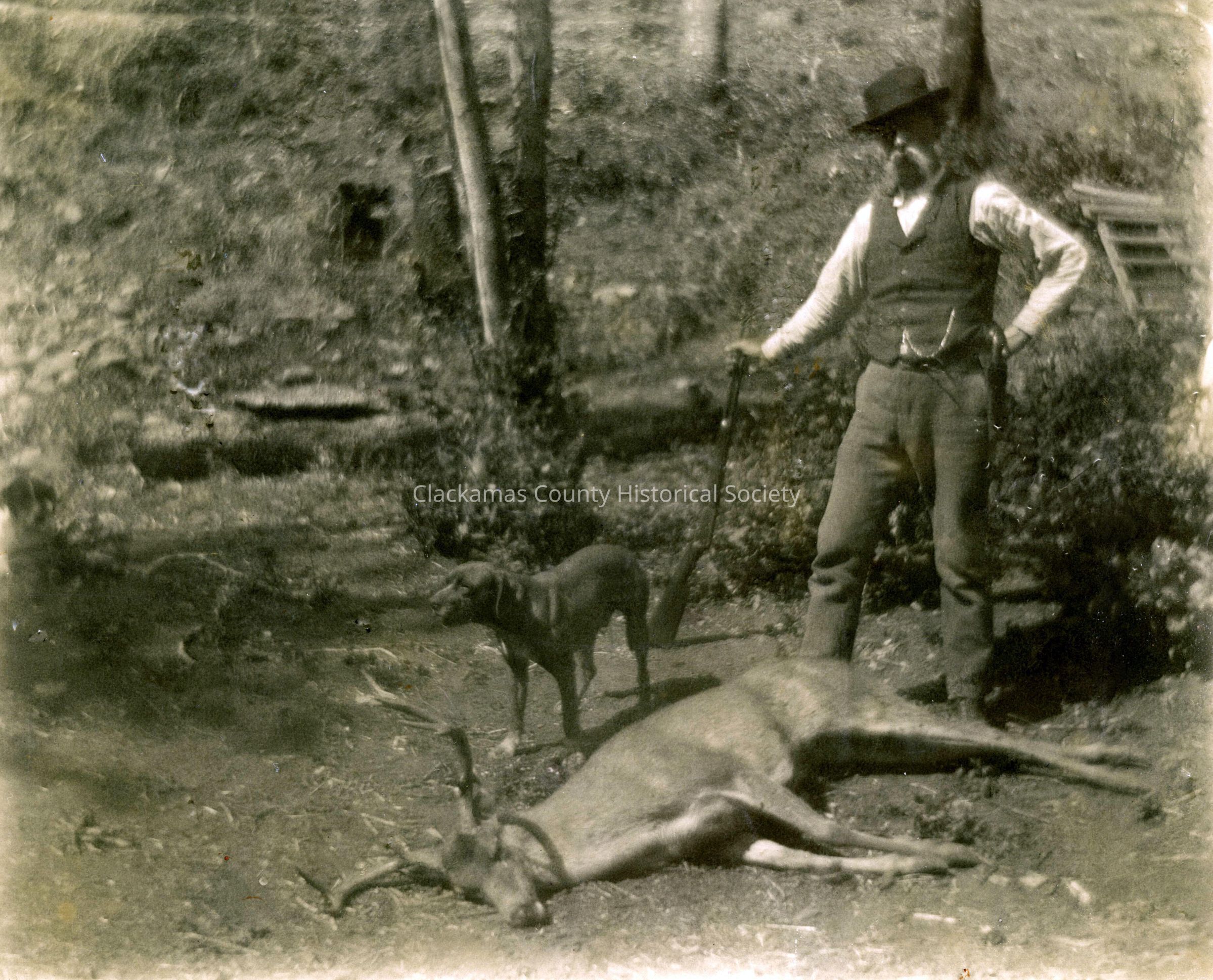 John A. Talbert, hunter with his hunting dog, standing over a deer.Made/Created