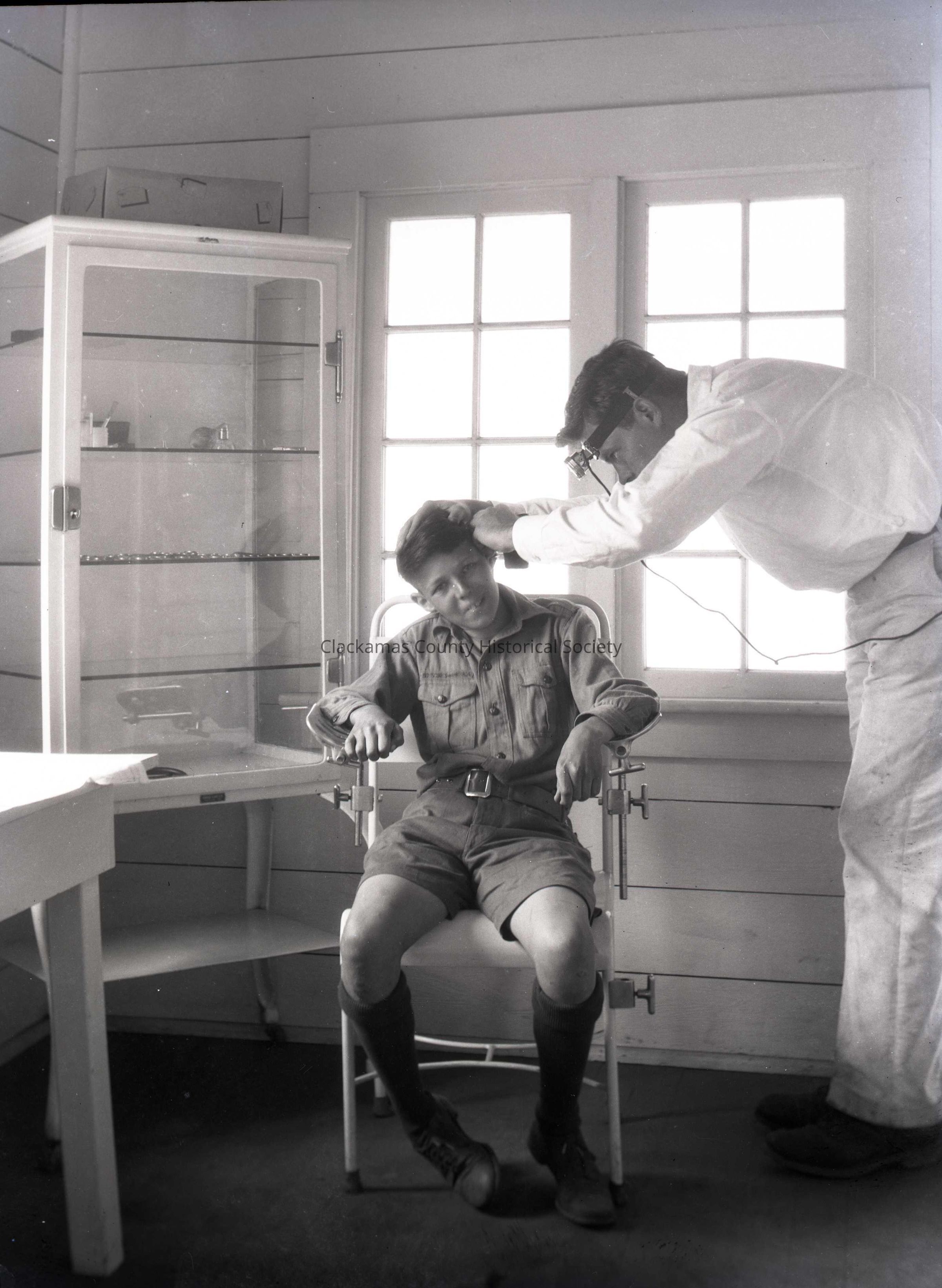 Photograph of Boy Scout receiving camp health check-up by Doctor. At the Camp Health Hospital Boy Scout Camp Merriwether Oregon.