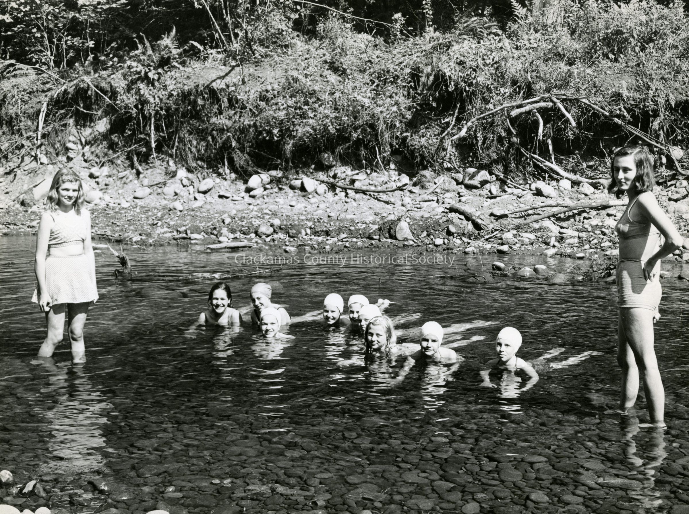 Camp Fire Girls swimming in the shallow water Camp Onahlee 1949