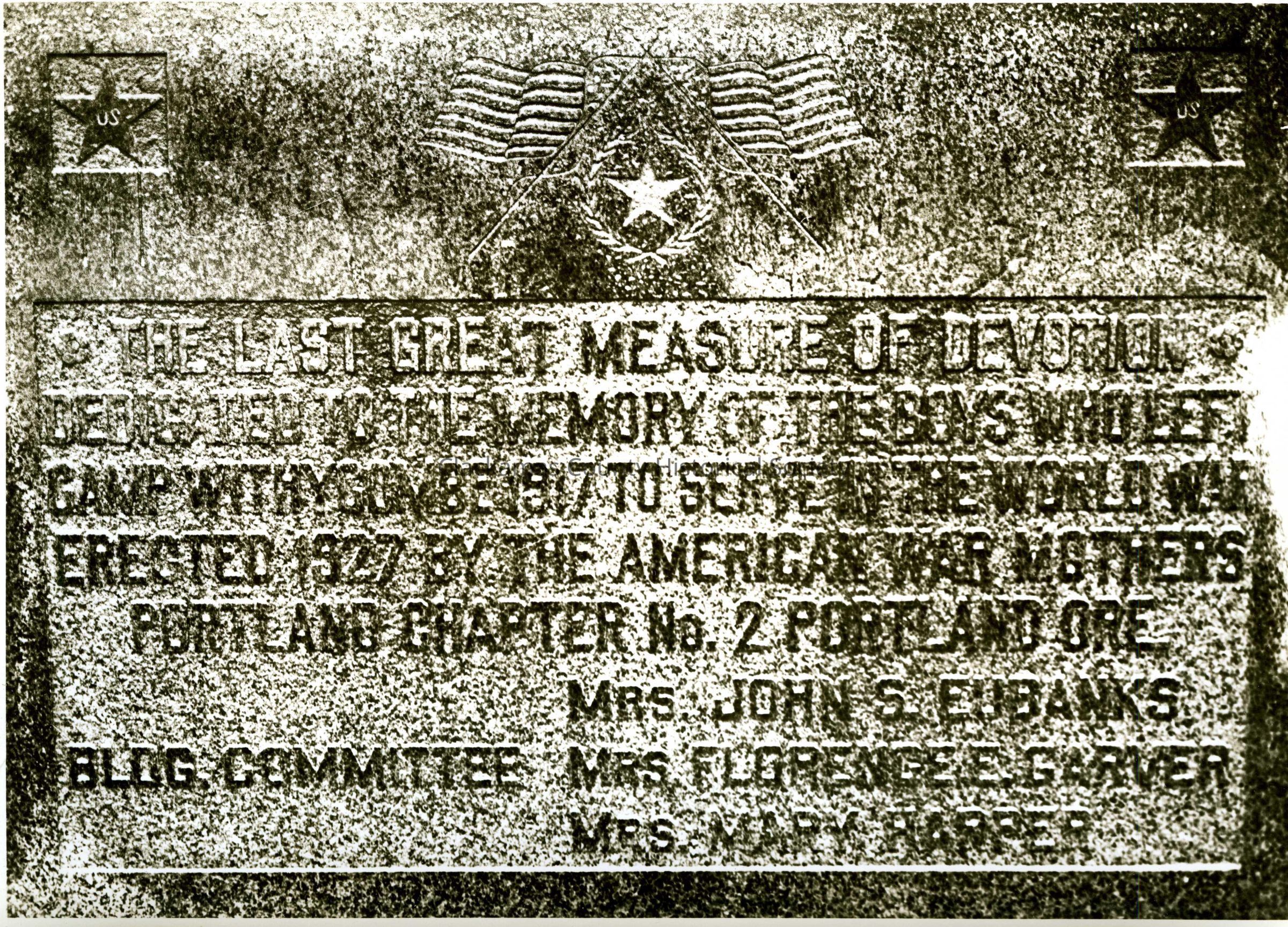 WW I Camp Withycombe Marker commemorating the departure of Clackamas soldier for the war. The marker was moved when I205 was built. The monument reads: