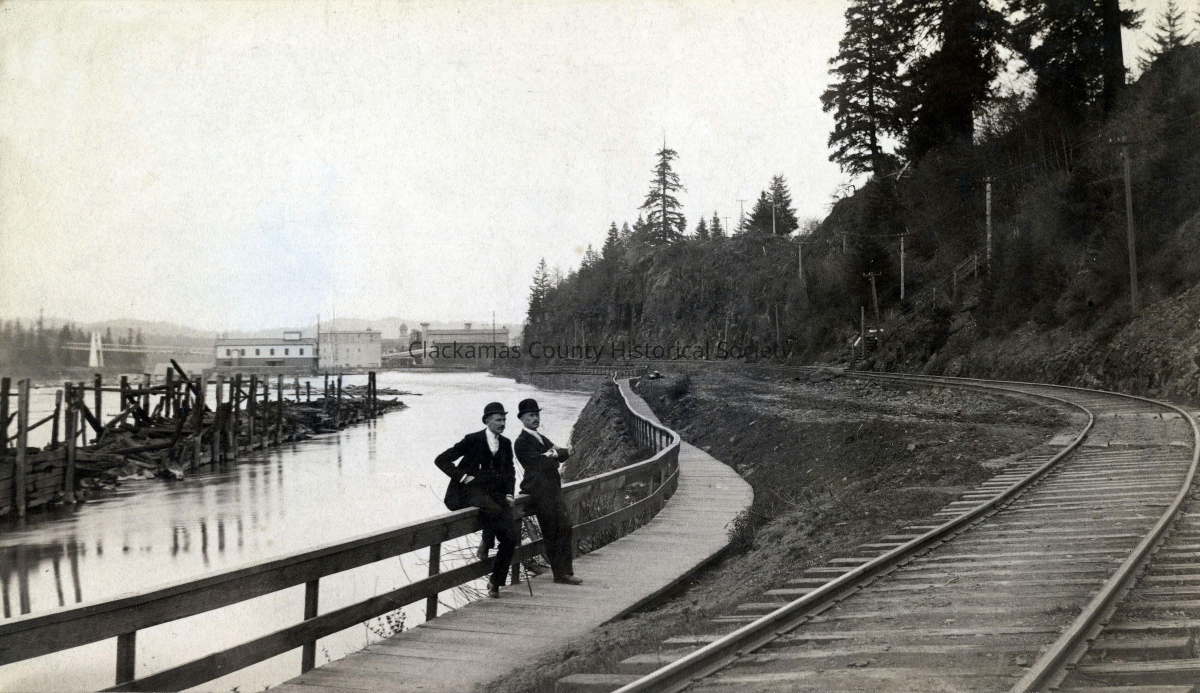 Clyde Huntley and Frank Lewis (L-R) on Canemah Walk. Basin and mills in background.