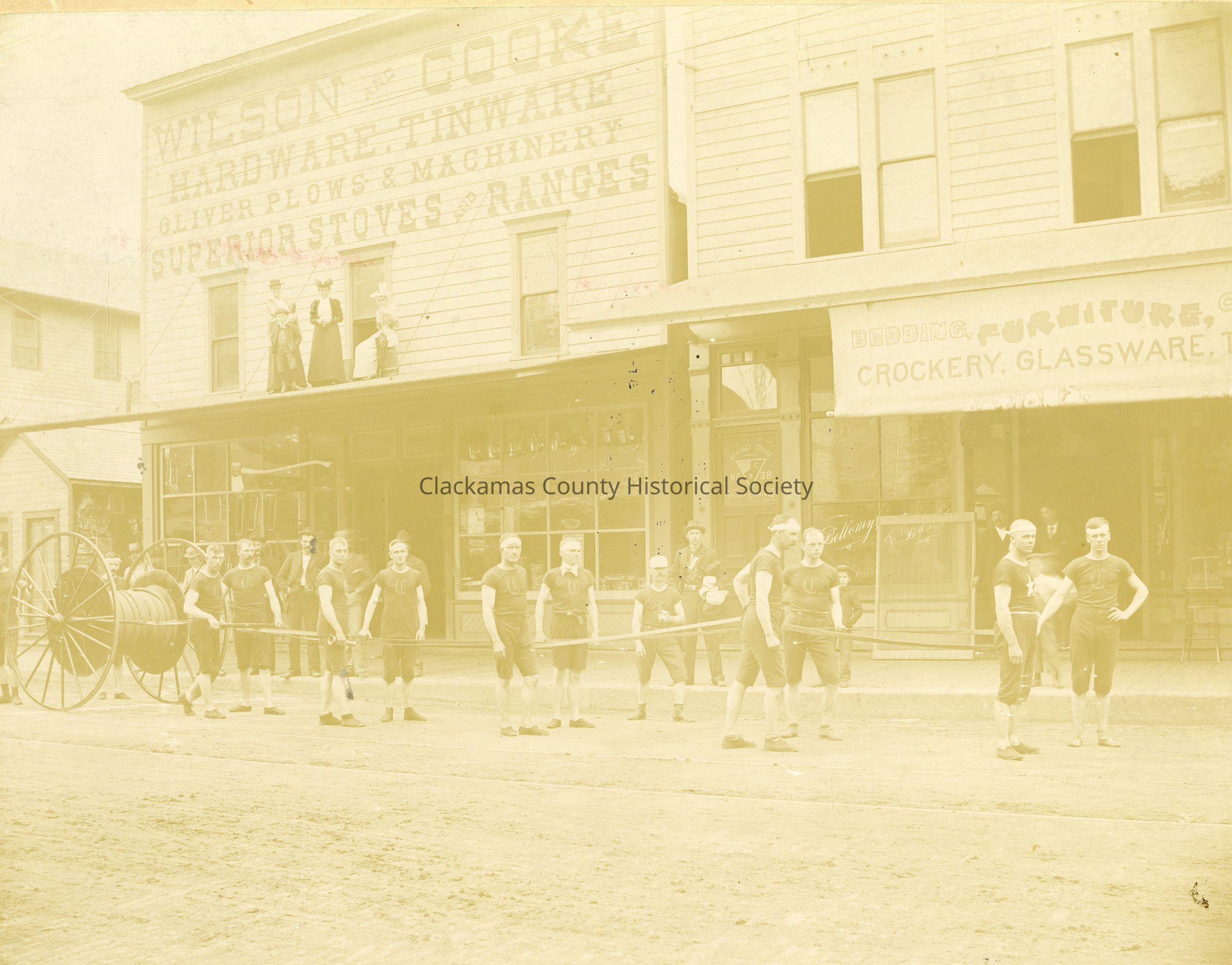 Oregon City Fire Dept., the Fountain Hose Company, in front of 516 (Bellomy & Busch) and 520 (Wilson and Cooke) Main Street. The Territorial Building on the east side of Main sits in its place. (JAH 11/2022)