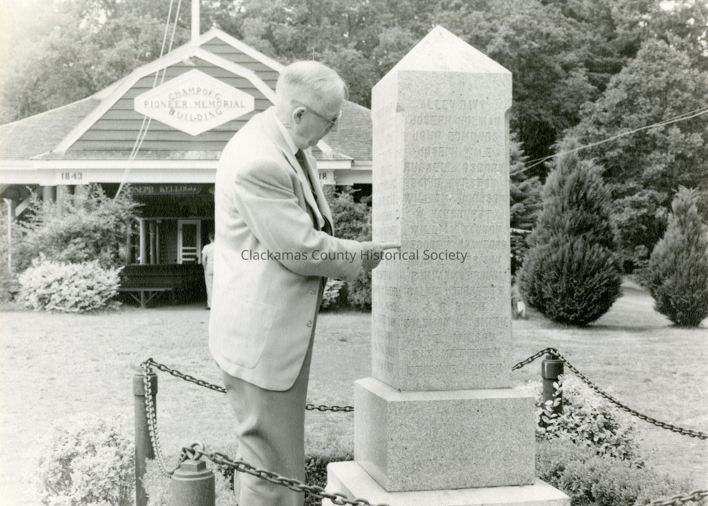 Champoeg Park 1948 - Memorial Marker - Harley Stevens II Pointing to Medorum Crawford NameEntry/Object ID