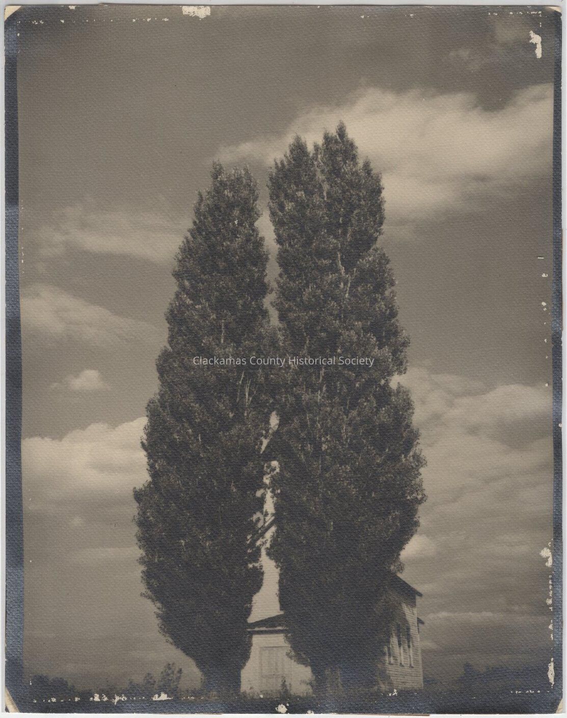 Chapel of Seventh Day Adventist Church Camp at New Era, Oregon Gift of L.Constans Building with two large trees