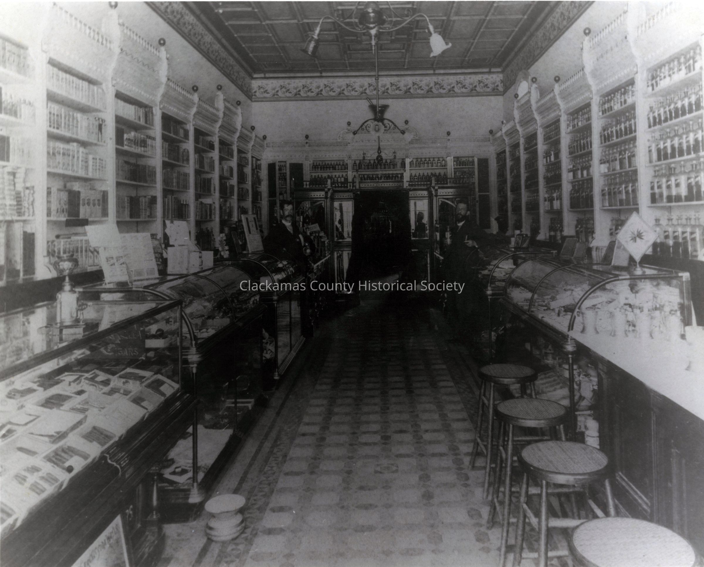 Charman Brothers Drug Store. 1897. Interior. 413 Main Street. Brothers Elmer Charman and T. Leonard Charman in photo.Made/Created