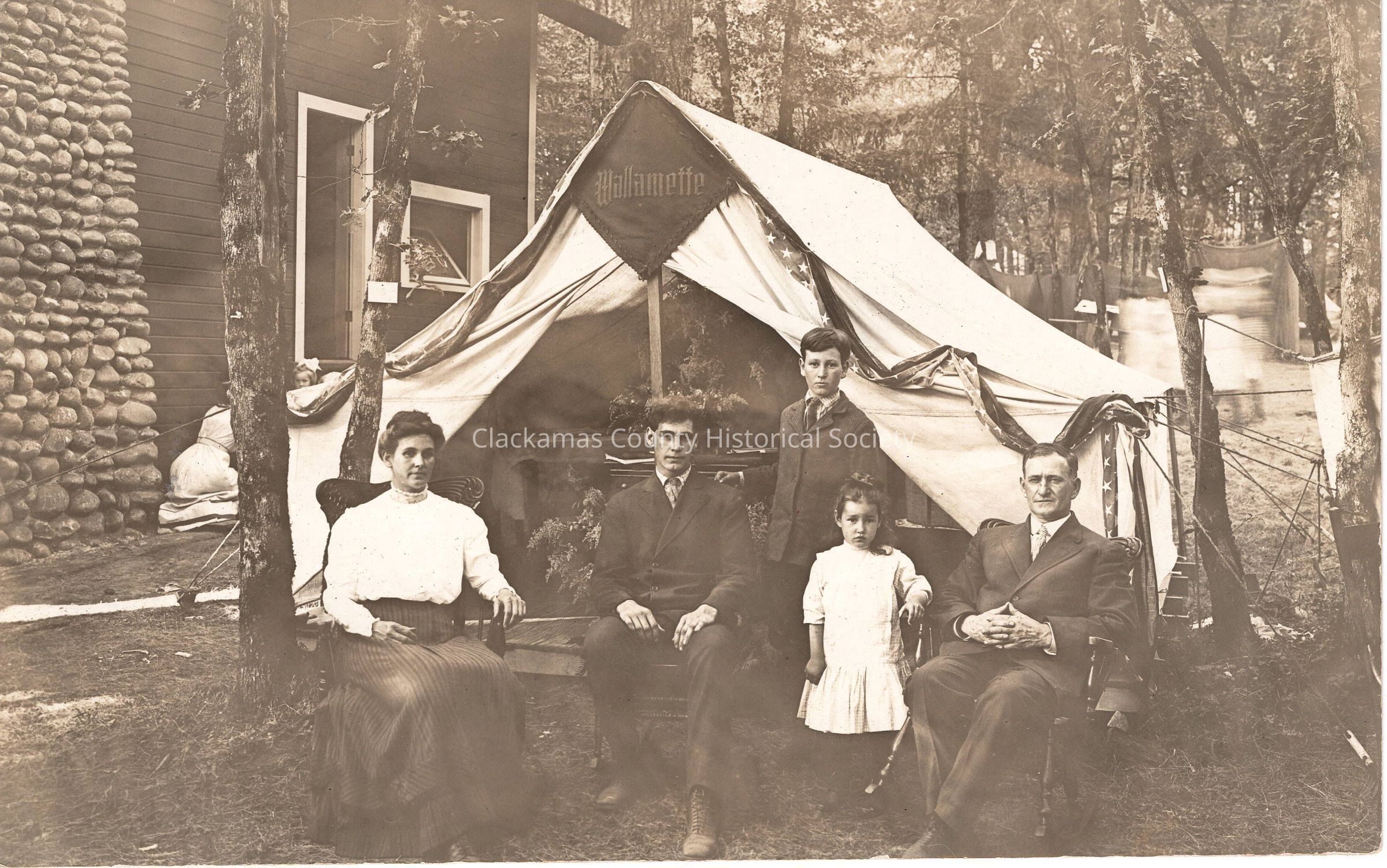 Gladstone, Chautauqua Park, shows family outside in front of the tent next to the Women's Christian Temperance Union headquarters house—built about 1911. The Gladstone Historical Society was recently (2024) given a photo of this building showing the entire front and most of the left side.Made/Created