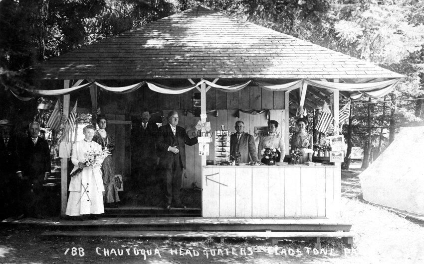 Chautauqua Headquarters, Gladstone, OR. Eva Emery Dye (with flowers) and Charles Dye. Mr. and Mrs. Harvey Cross.Made/Created