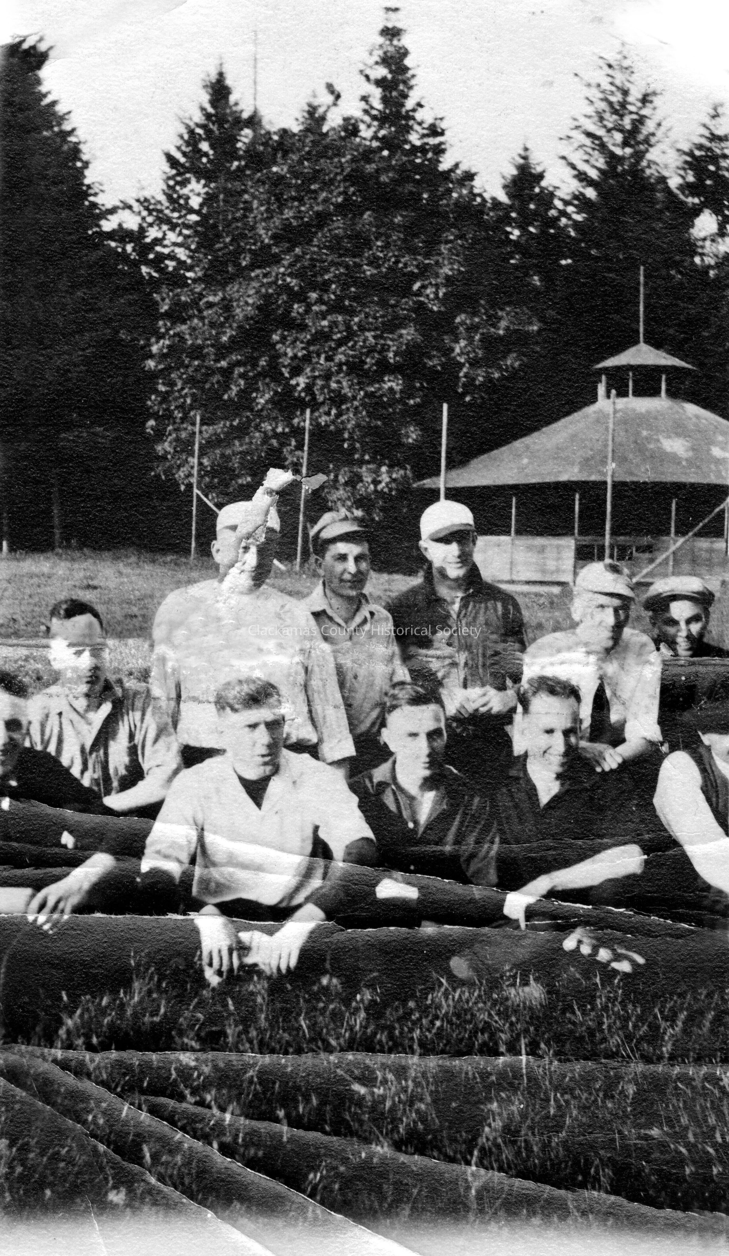 Chautauqua. 10 Men Sitting on Lawn. Writing on back of photo looks like office force of Willamette Pulp and Paper at Chatauqua Park in Gladstone, about 1925. Names difficult to read. Merrit Willson, Glen Jack, Bowland, others. Jim, Julian?, John,Made/Created
