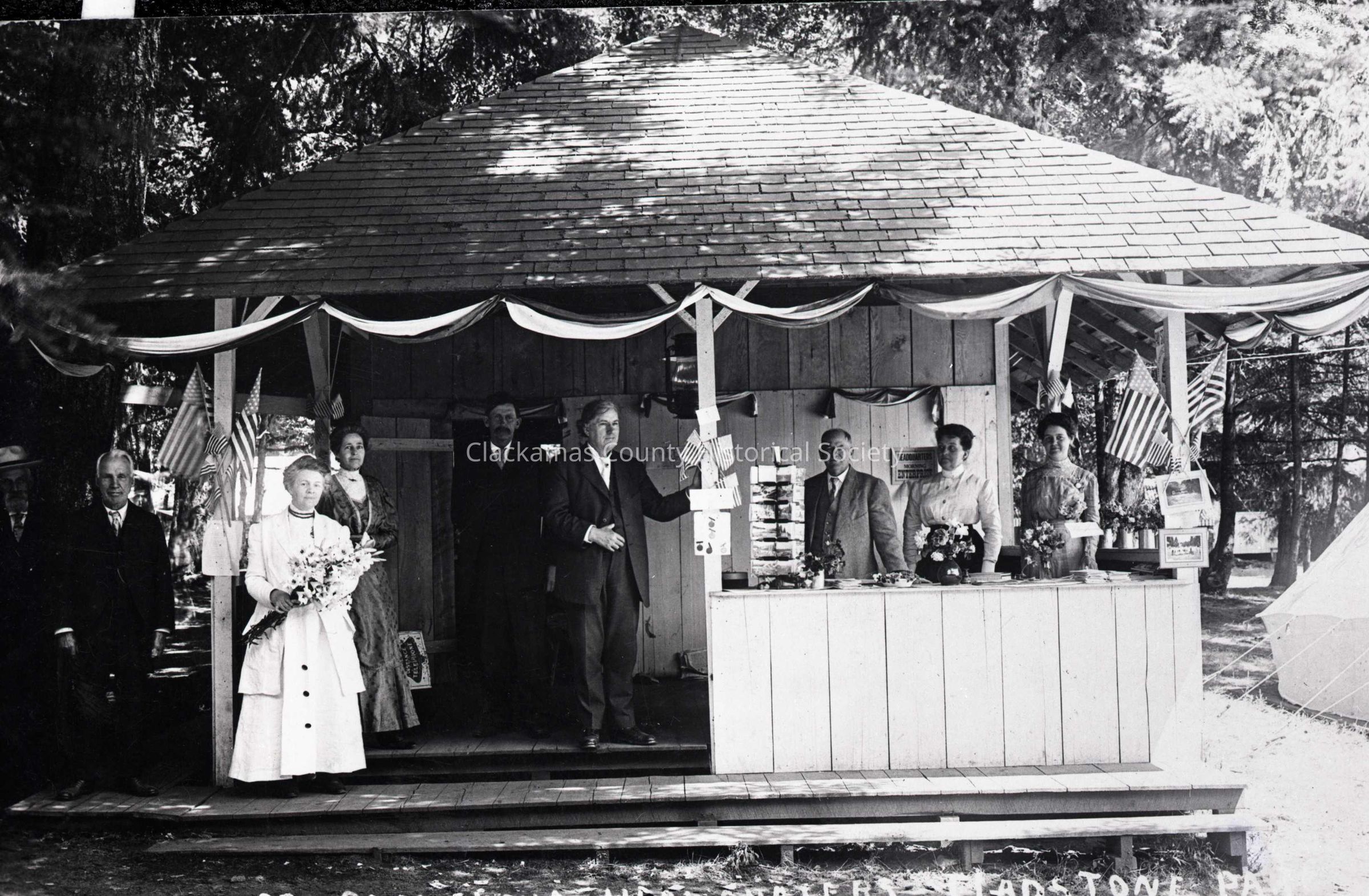 Officers (L-R on platform): 1) Orfa Cross 2) Eva Emery Dye; 3) Harvey Cross; 4) Charles Dye; rest are unidentified.Made/Created