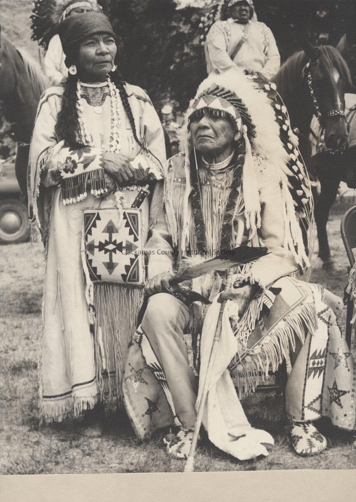 Black and white of Chief Tommy Thompson and wife Flora Thompson Chief seated Wyam tribe of Columbia