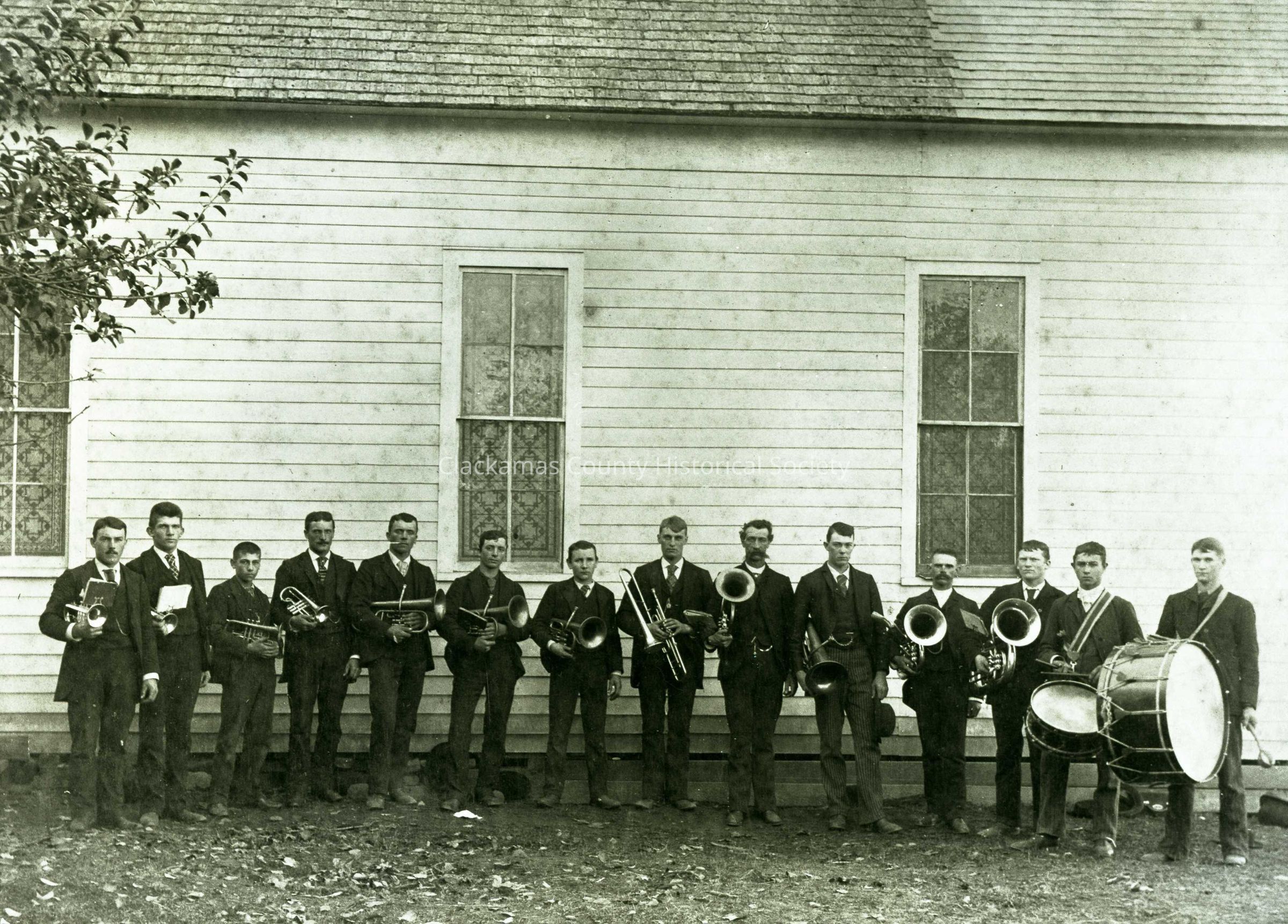 Clackamas Band, in front of original school house. J.A Talbert is 6th from rightMade/Created